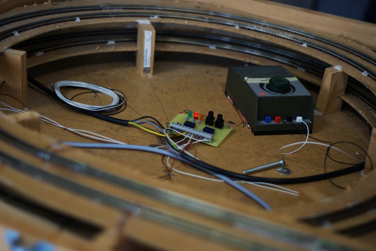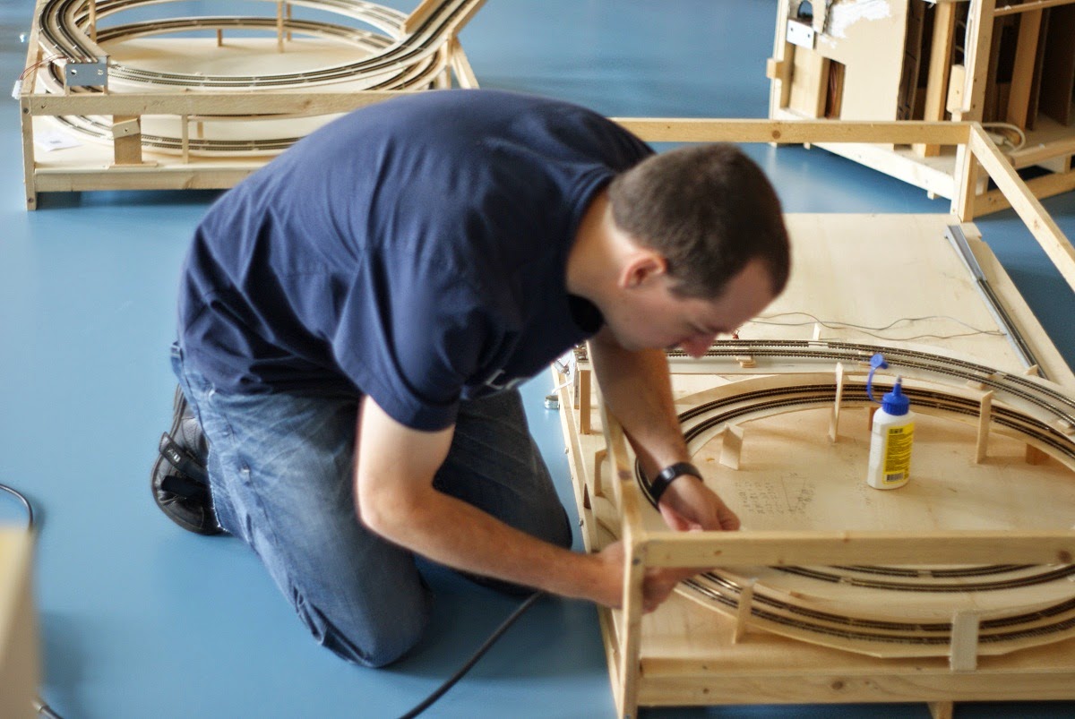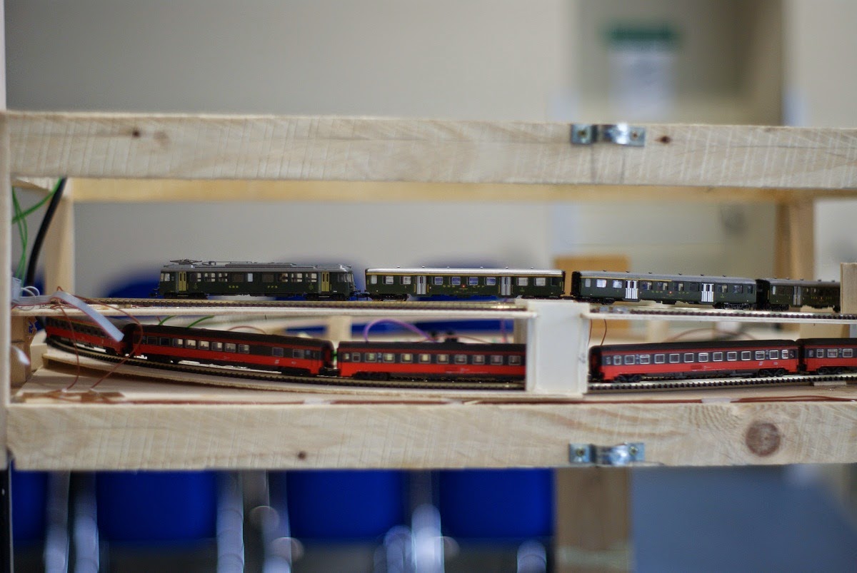 En fin de journée, on pouvait se taper dans les mains: les blocs étaient installés et testés (le dimanche, il faudra encore croiser quelques câbles et surtout se familiariser avec le fonctionnement, mais nous avons eu jusqu’à 12 trains en circulation simultanée!)