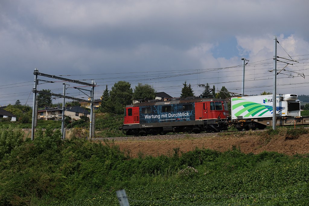 5 Cargo promène ses locs... retour d'une autre en solo... En l'occurence, il s'agit ici de la Re 4/4 III 11353 qui a été louée au SOB. On arrive d'ailleurs encore à lire l'inscription SÜDOSTBAHN sur le côté et on la reconnaît à ses tampons rectangulaires.