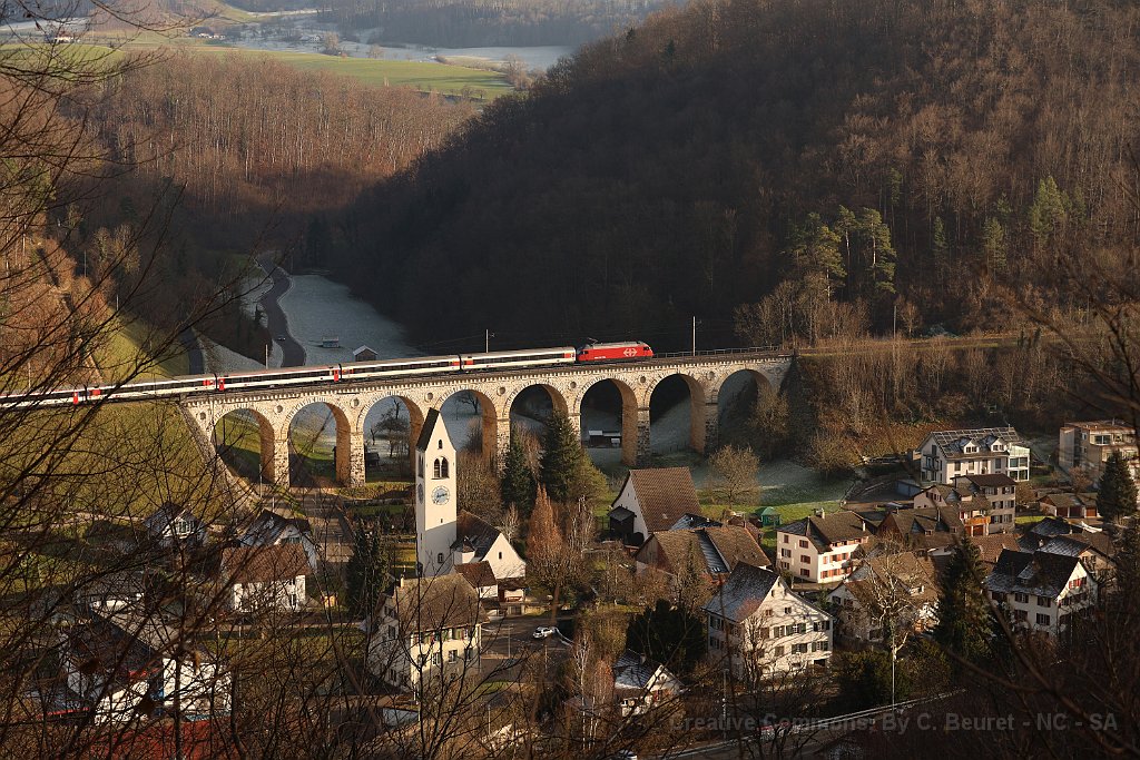 109 Une Re 460 avec une rame de voiture EC sur le viaduc de Rümlingen