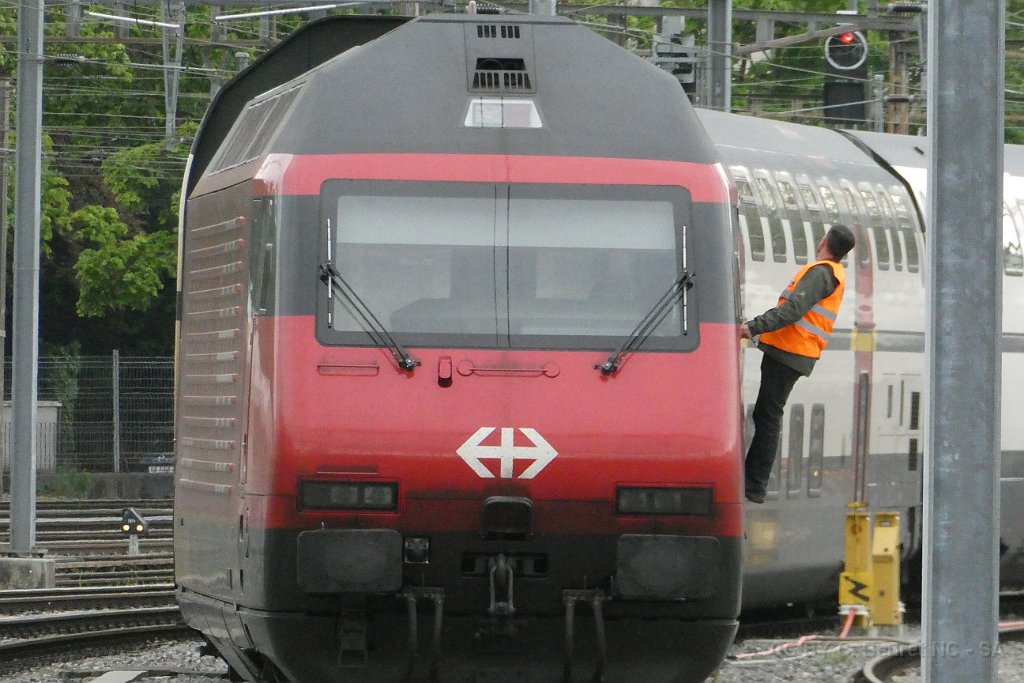 83 Un mécanicien en position acrobatique sur une Re 460 à Bern