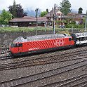 28 Langenthal. La Re 460 099 avec un logo tronqué. Cette locomotive portait la publicité blick qui couvrait la partie supérieure du logo. Comme la partie inférieure devait être rouge, le logo a été masqué. Une fois la pub enlevée, il reste ce logo tronqué...