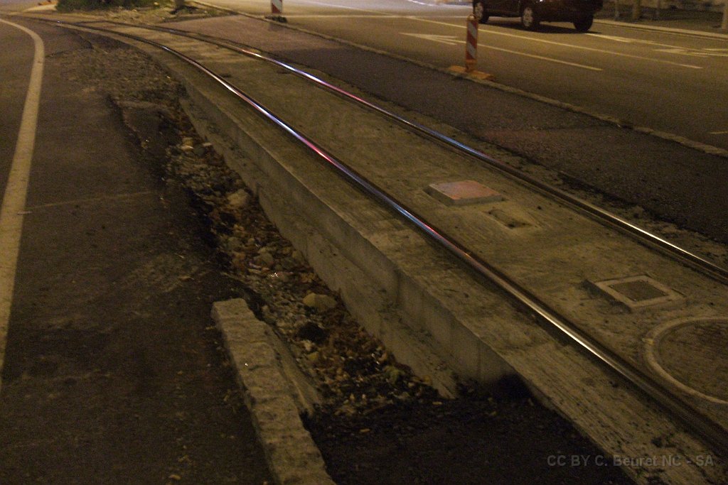 2 Détail de la pose de la voie entourée de caoutchouc isolant pour éviter les courants vagabonds.