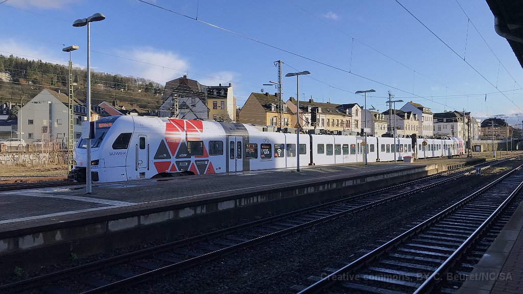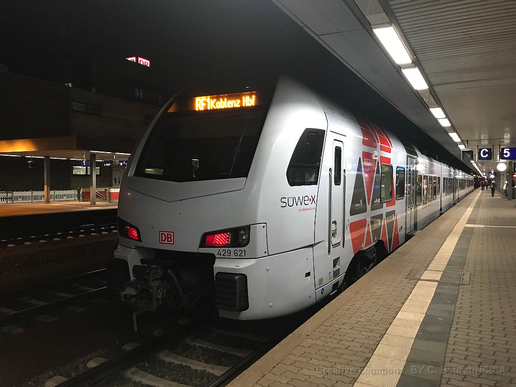 14 Série 429 (Flirt 3) arrivant à Trier avec un RE1 Homburg - Koblenz Hbf SÜWEX (Südwest Express) et la marque sous laquelle roule DB Régio en Saare et Rhénanie-Palatinat