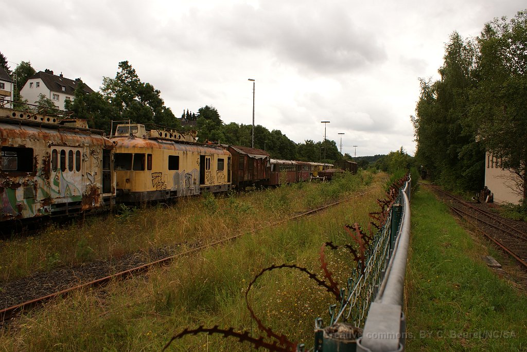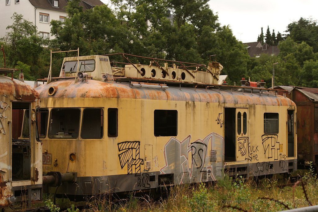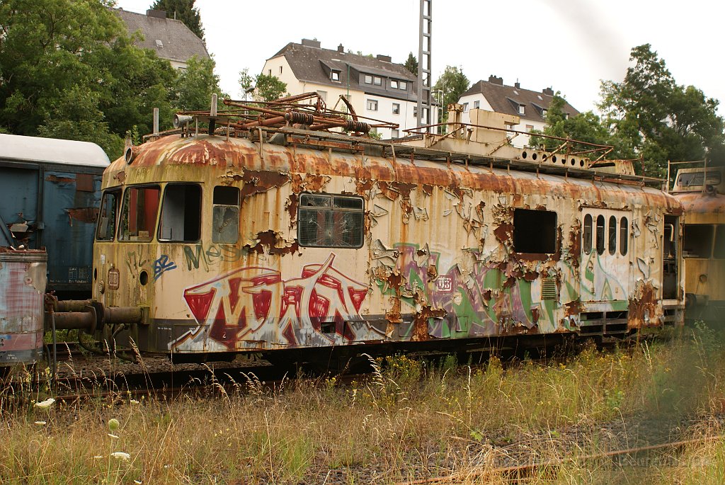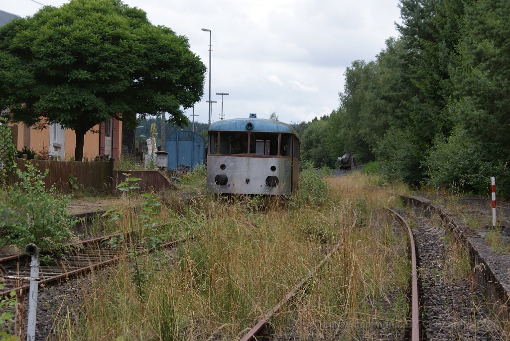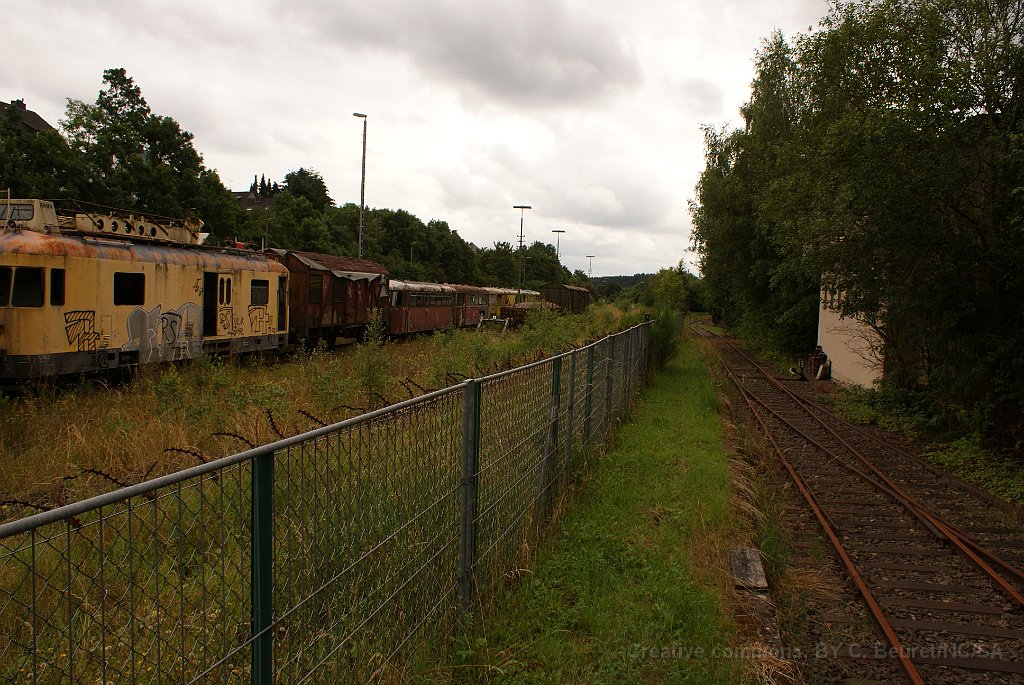 Dans les broussailles de la voie au-delà d'Hermeskeil, un Schienenbus rouille, abandonné. Un autre, au bord du quai envahi par la végétation Un ancien 701 pour travaux de caténaire 701 et Schienenbus en série à Hermeskeil Ex 701 120-8 L'ancien matériel du Hochwaldbahn souffre de l'usure du temps...