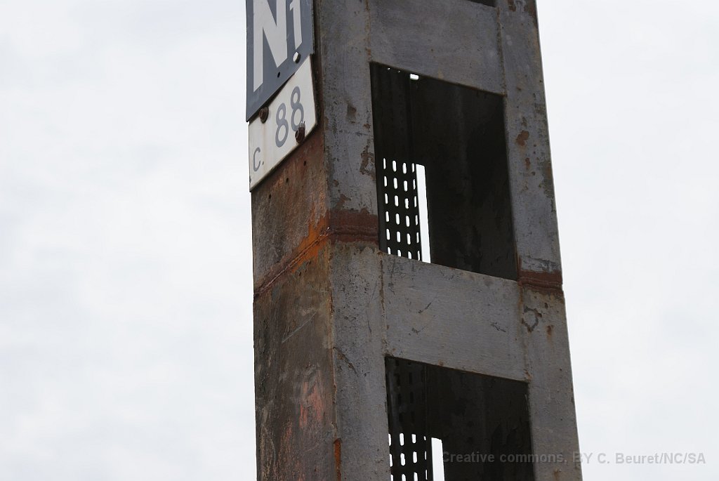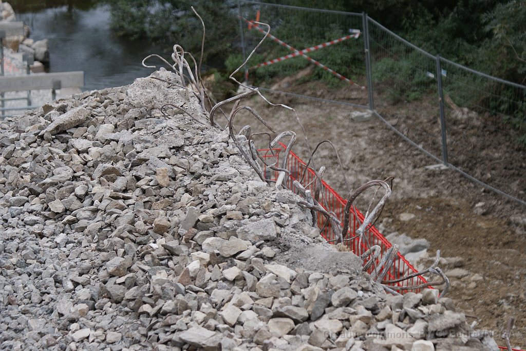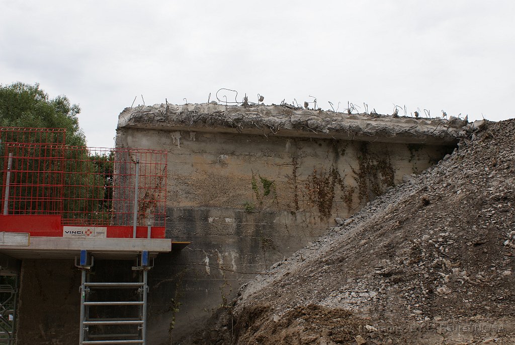 148 La partie basse des piles de l'ancien pont était encore bonnes et ont été gardées, mais le haut, reconstruit après la 2ème guerre mondiale était trop friable et a été remplacé par ces coiffes de béton.
