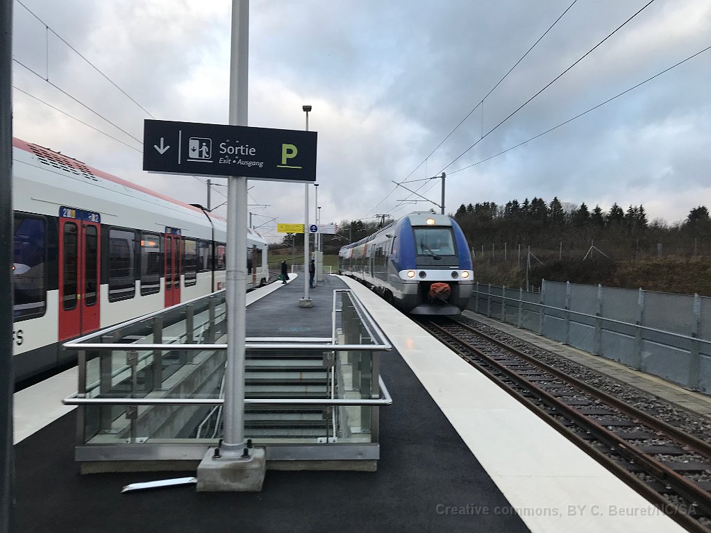 166 Halte de Meroux (TGV), rencontre du Flirt venant de Suisse et de l'AGC venant de Belfort.