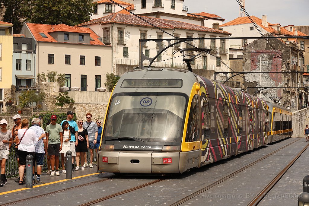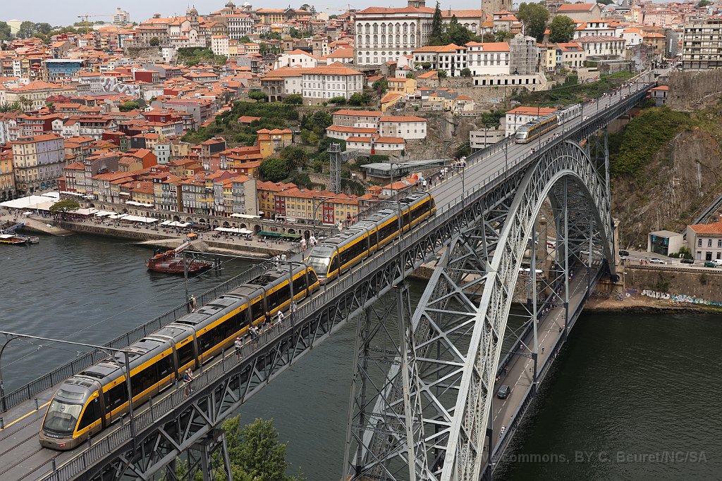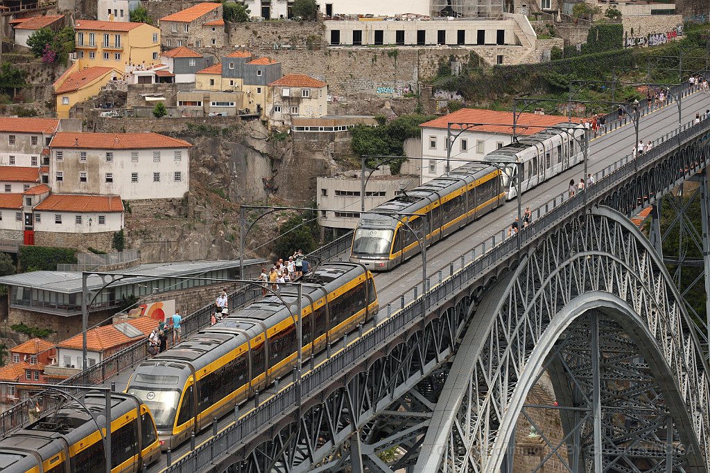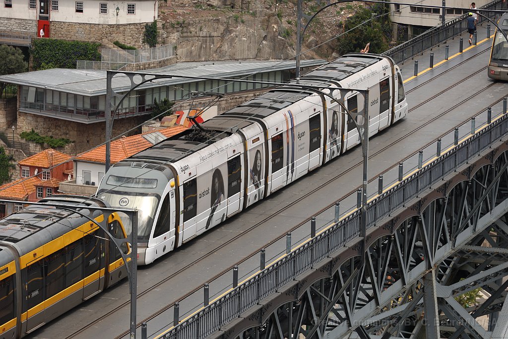 Rame du Métro de Porto (qui est en ait plus un tram avec lignes souterraines) à Jardim de Morro A Matosinhos Sul Sur le Ponte Luis I Le célèbre Pont Luis I avec deux rames de métro Croisement sur le Ponte Luis I Rame publicitaire Dyson