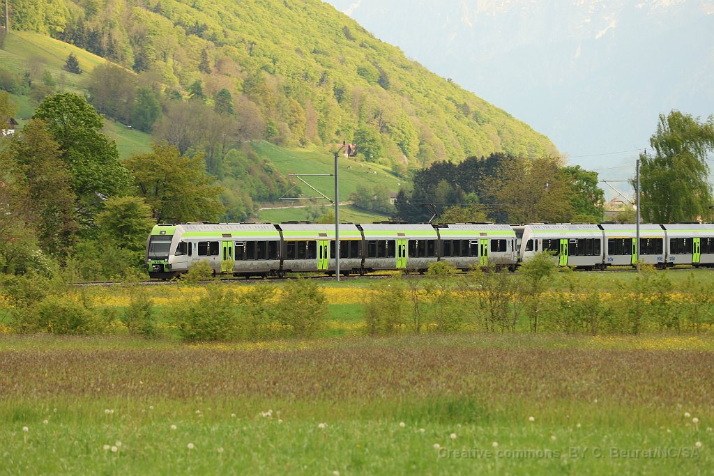 25 3 Lötschberger en UM dans la vallée de l'Aar. Le train sera scindé à Spiez avec une partie vers Brig (par l'ancienne ligne du Lötschberg et le reste vers Zweisimmen)