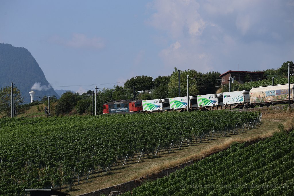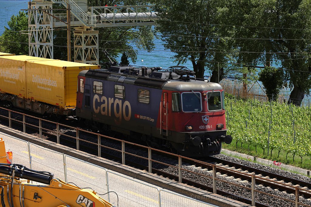 19 Re 420 270-1 avec un train postal au bord du lac de Bienne à côté du chantier du tunnel de Gléresse.