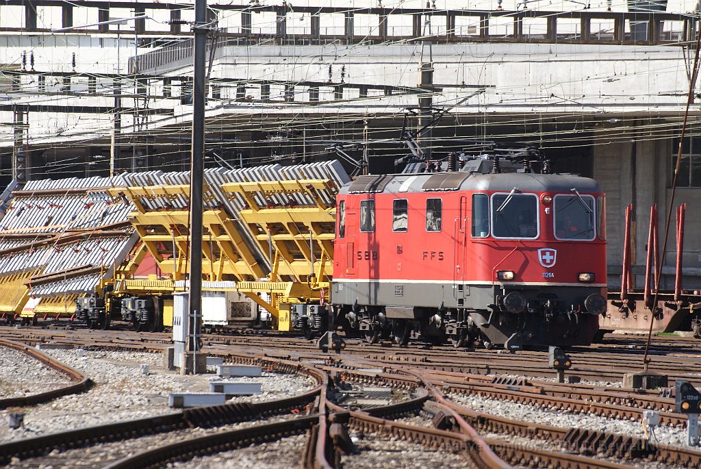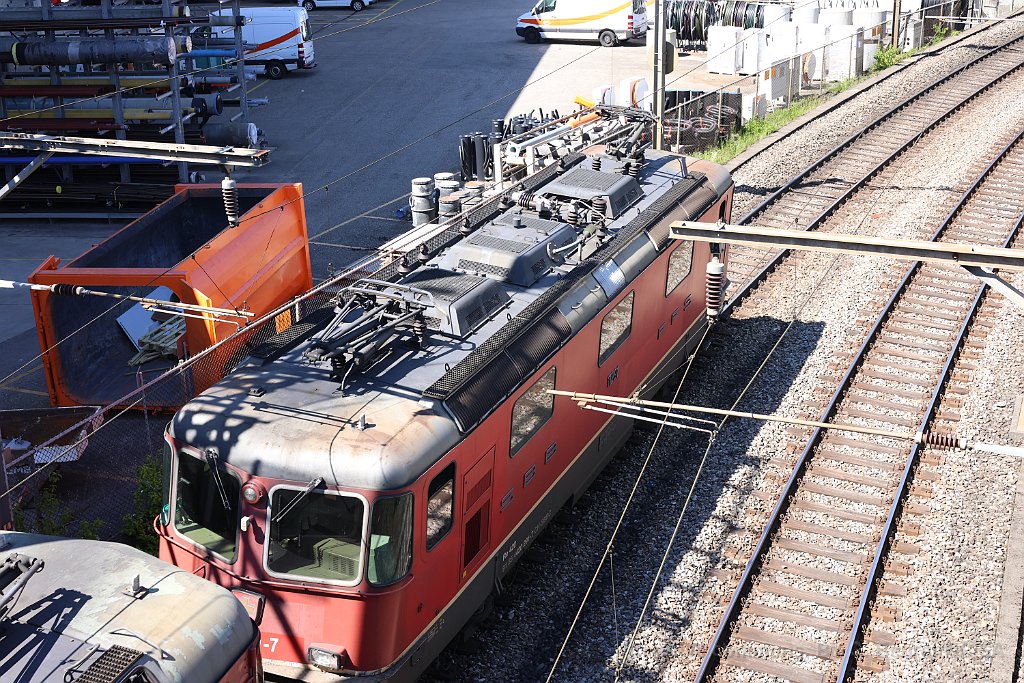 69 Un train de transfert de matériel à Berne avec 2 Re 460, 1 Re 4/4 II, 1 A IC2000, 1 Bpm 61, 1 AD IC2000 et 1 B VU IV. Ici la Re 4/4 II. Elle est tirée et roule pantographe baissé.