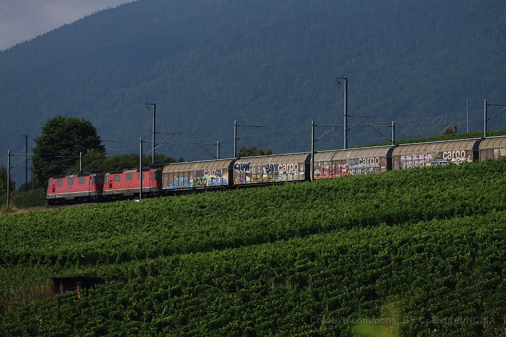 88 Une UM de Re 420 de CFF Cargo (mais en livrée rouge) avec un train de marchandises dans les vignes entre Auvernier et Colombier