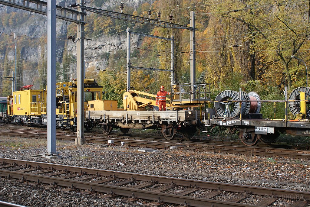 Wagon d'accompagnement pour la grue Kirow Train de travaux à Saint-Maurice Nacelle pour les travaux sur caténaire Véhicule d'intervention pour travaux sur la caténaire à Saint-Maurice Wagon couvert pour le service de la voie à Bern Tm 232 "Kari" à Bern
