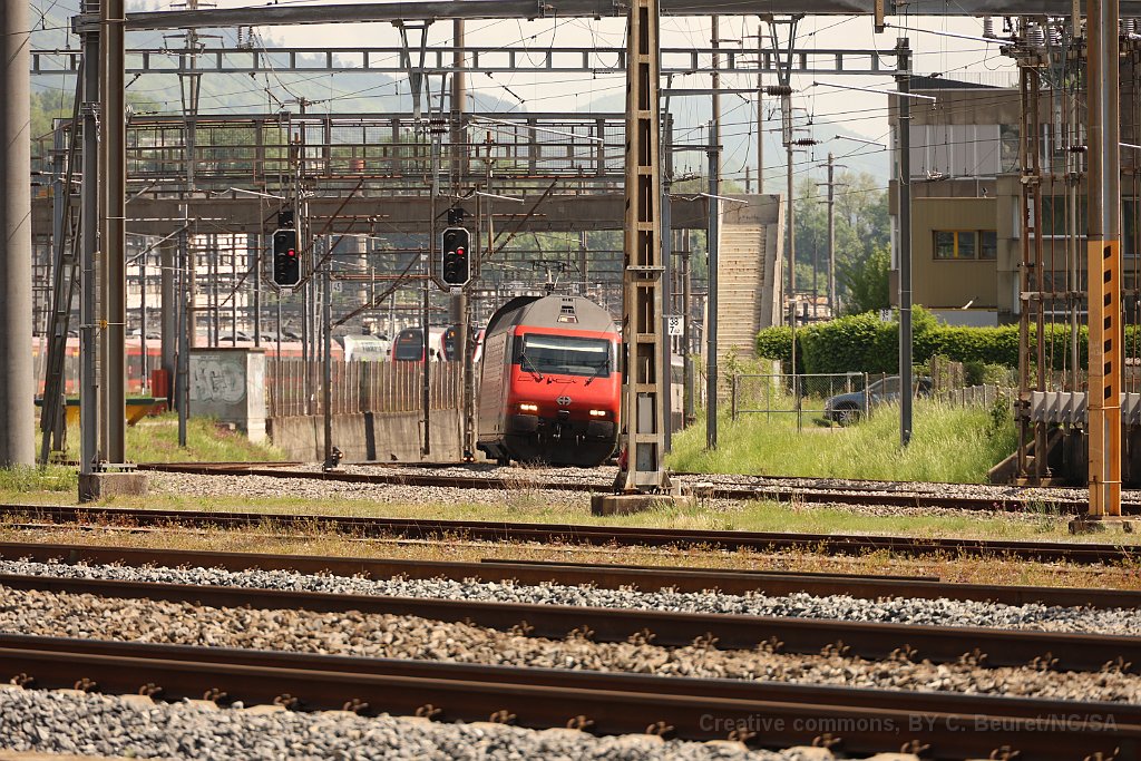 56 Re 460 avec un IC sur le plateau. On note les anciens mats de la ligne de contact.
