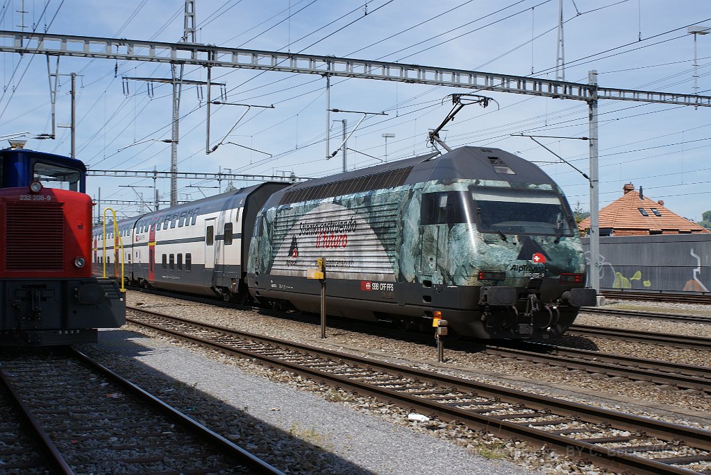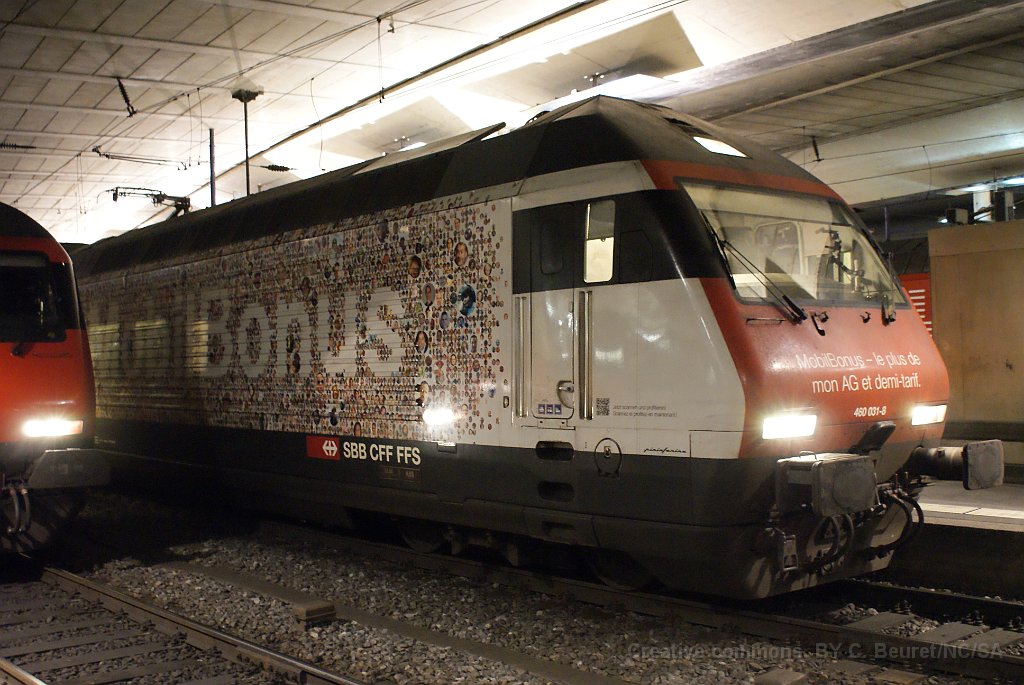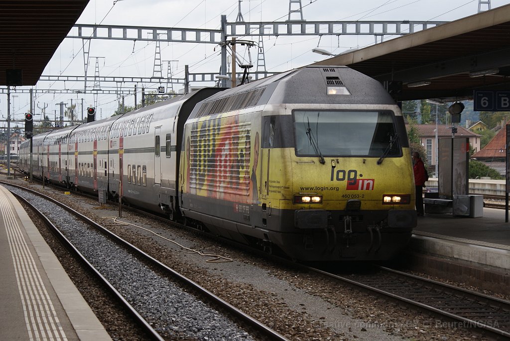 La 053 et publicité Login à Biel/Bienne Sergio, Benoît et Beat (SBB) font de la publicité pour les offres de loisirs CFF à Brugg La Alp Transit à Ostermundigen Re 460 "Alp Transit" en queue d'un IC Interlaken - Romanshorn à Ostermundigen Re 460 MobilBonus en queue d'Un IC St-Gall - Genève-Aéroport à Fribourg La Re 460 105-0 avec pub VSLF en tête d'un IC de passage à Nyon