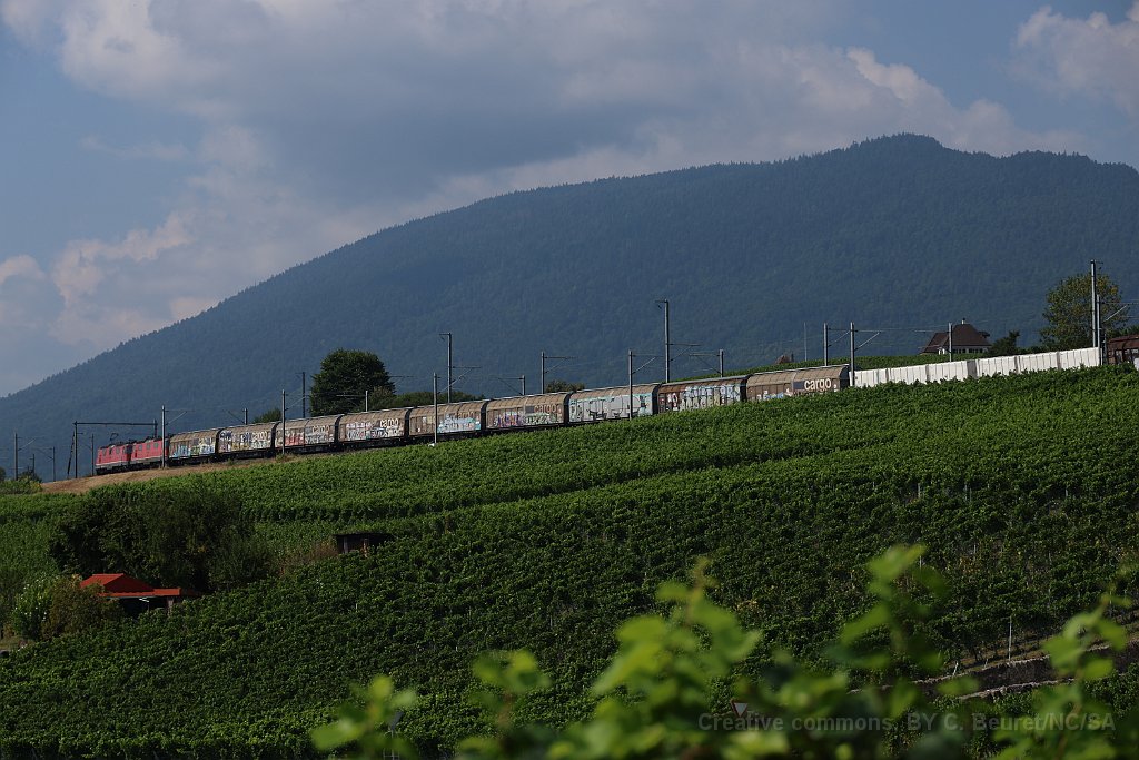 Passage d'un train de marchandises à Neuchâtel Wagon plat avec des pièces d'une grande roue Faccs-z pour le transport de ballast à Renens Morges, transport militaire Langenthal Eaos avec bettraves à Payerne.