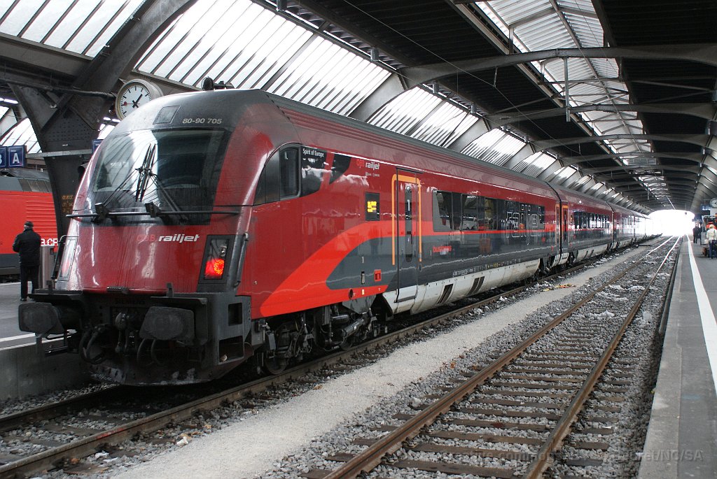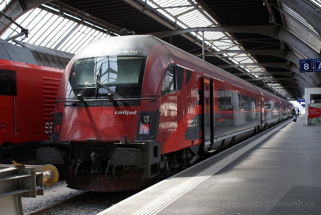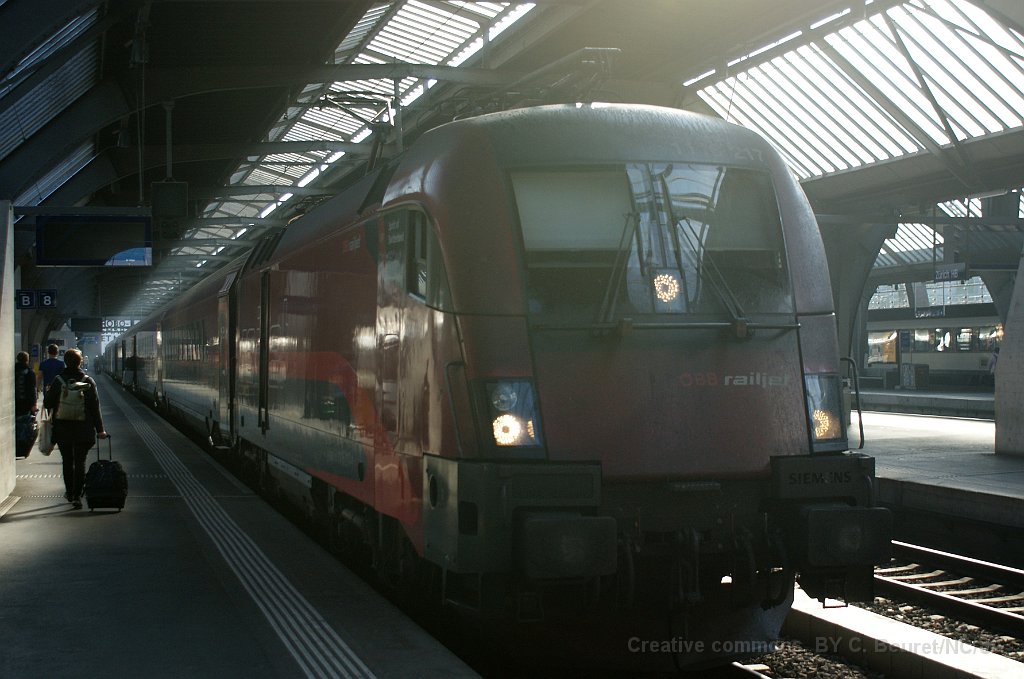 Voiture-lit autrichienne à Zürich Zürich: rame Railjet prête au départ Railjet à Zürich Voiture-pilote du RailJet à Zürich HB Voiture de commande Buisiness/1ère classe à Sargans Taurus Railjet dans la plaine de la Linth