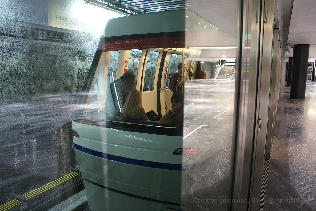 1 Skymetro à l'aéroport de Zürich pour relier aller au terminal E. Oui, il s'agit bien d'un funiculaire, même si le trajet est horizontal. Les rames sont fixéees à un câble et peuvent aussi être décrochées (pour rallonger ou raccourcir la rame)