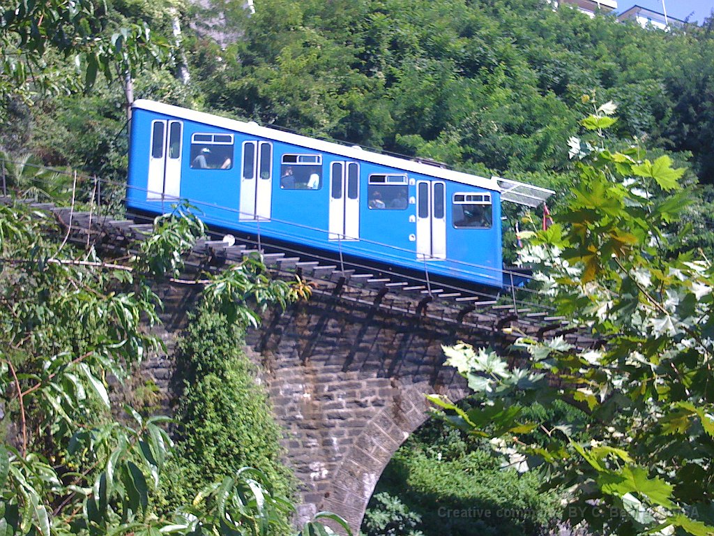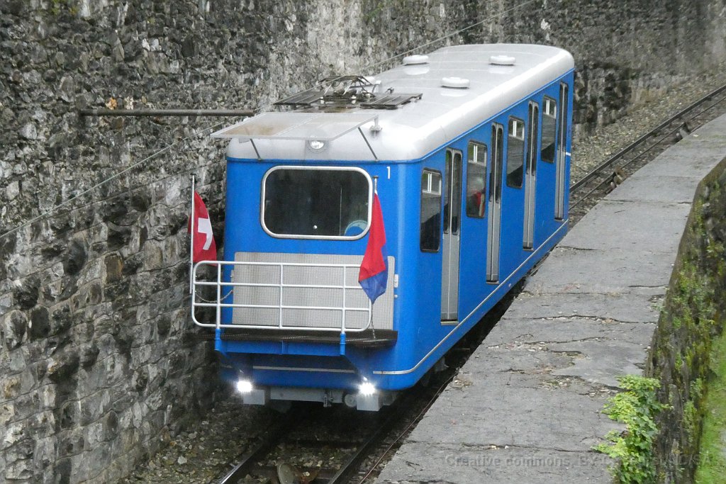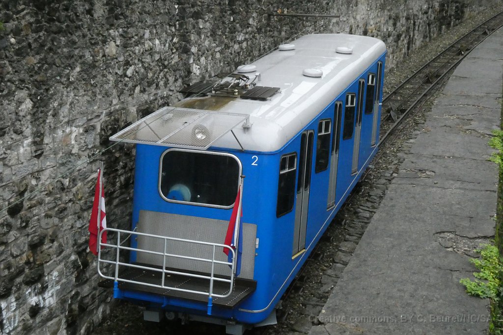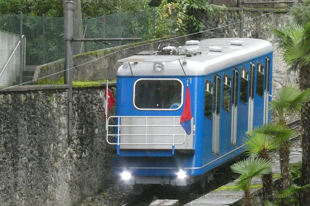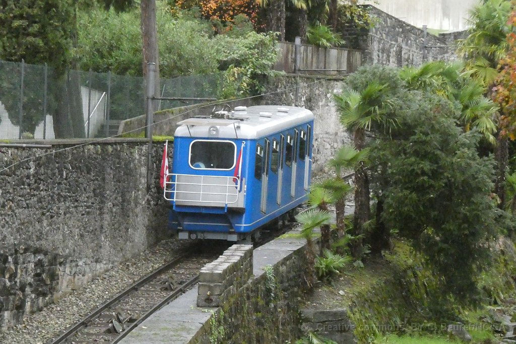Les deux cabines du funiculaire de la Madonna del Sasso à  Locarno près de l'évitement. Peu avant d'arriver à la station supérieure La cabine 2 à la hauteur de la Via Cappucini Cabine 2 montante Et quelques instants plus tard, la 1 descend Cabine 1 peu à la hauteur de la via Cappucini, soit un peu plus de 100m avant d'arriver à la station inférieure