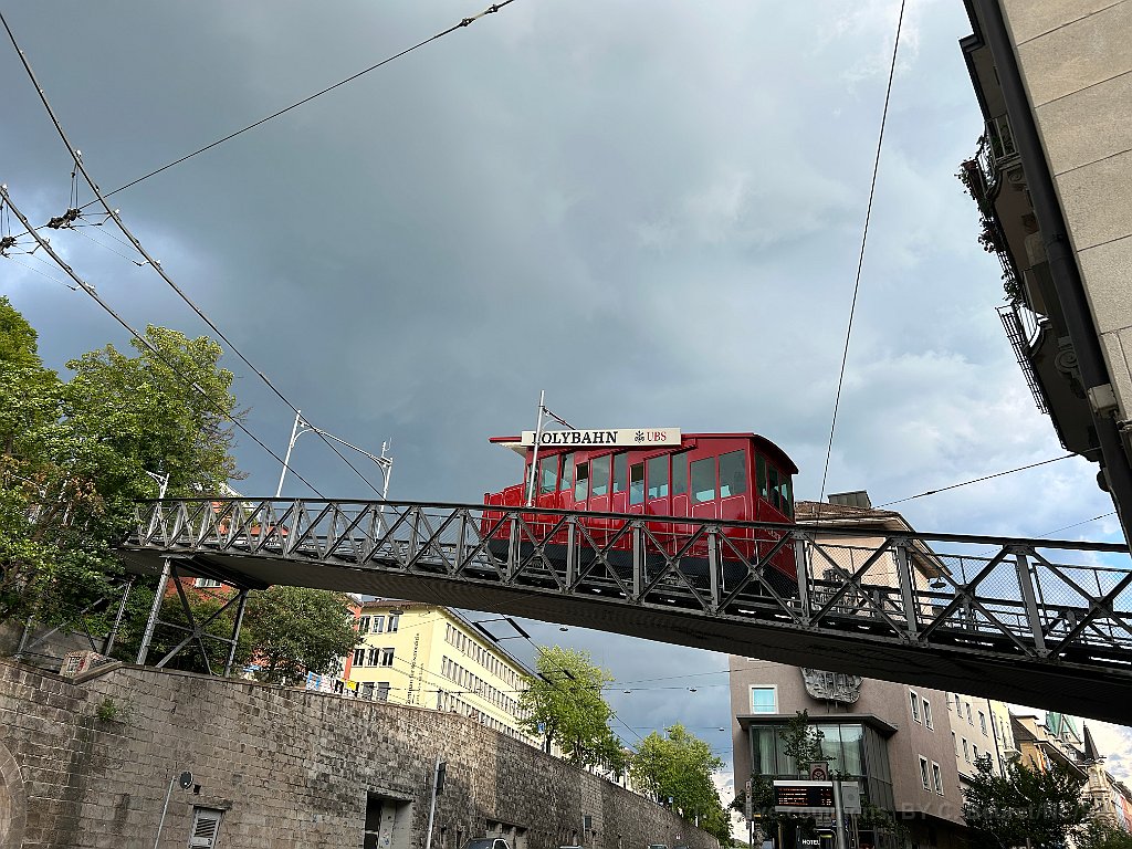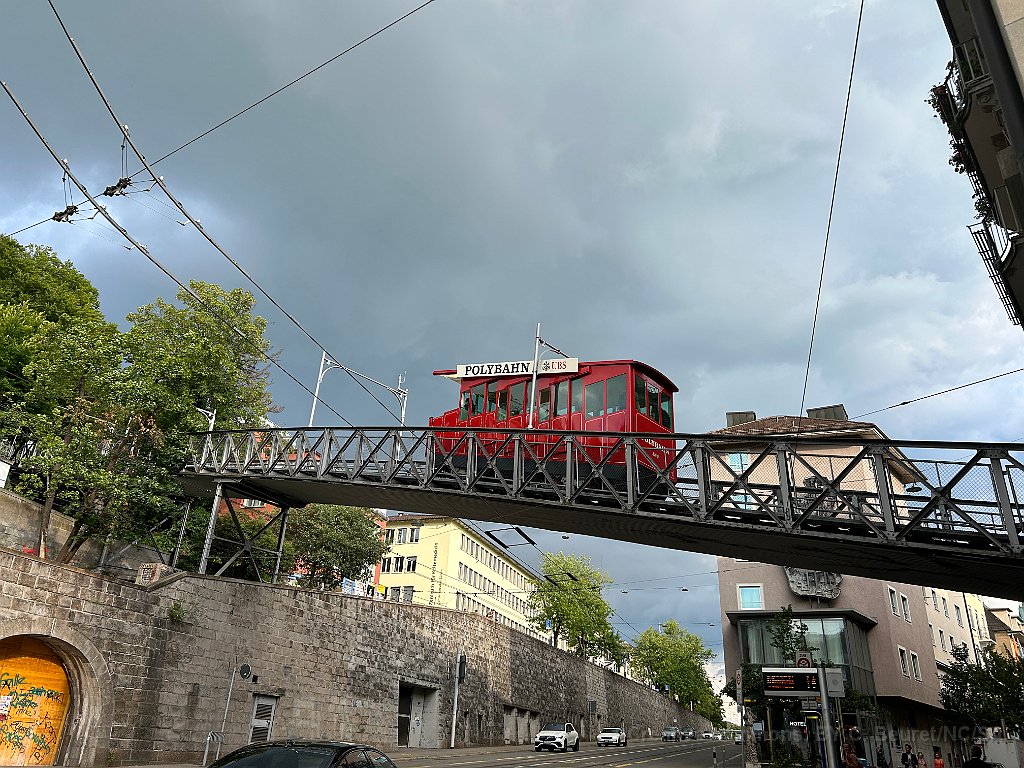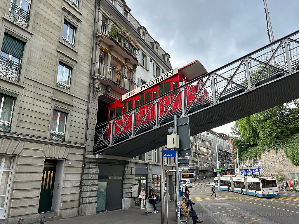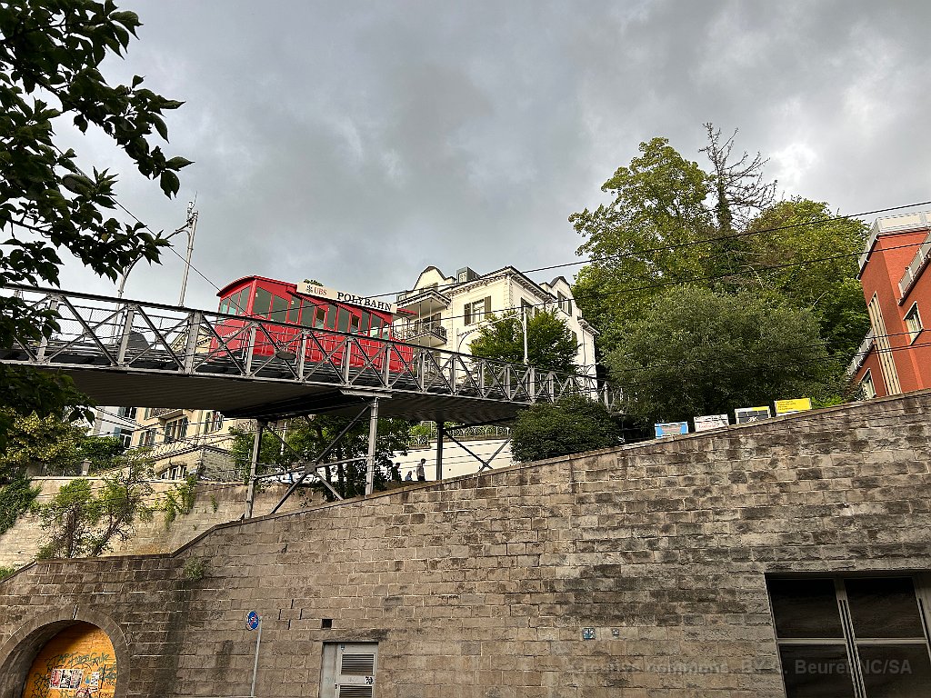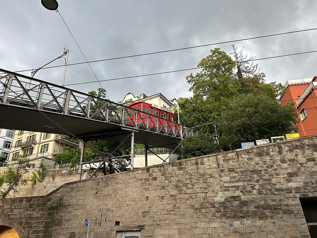 Peu après la station de départ, le funiculaire passe un beau pont métallique Cabine montante La station inférieure est dans un immeuble Vu de l'autre côté Un beau funiculaire à l'ancienne