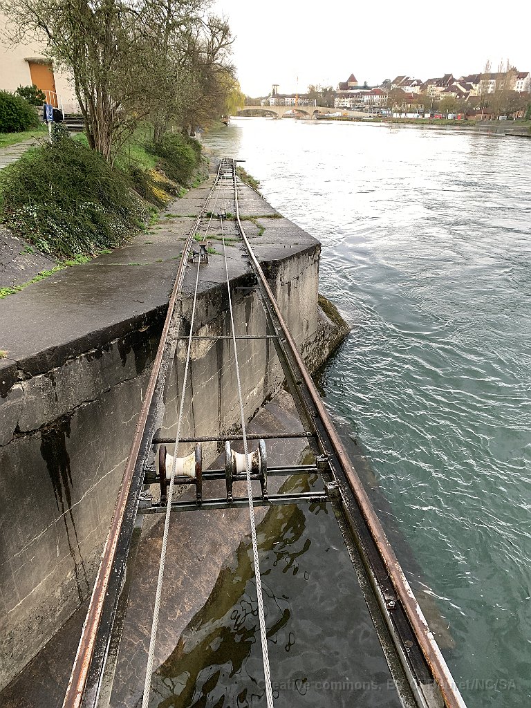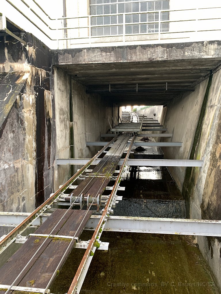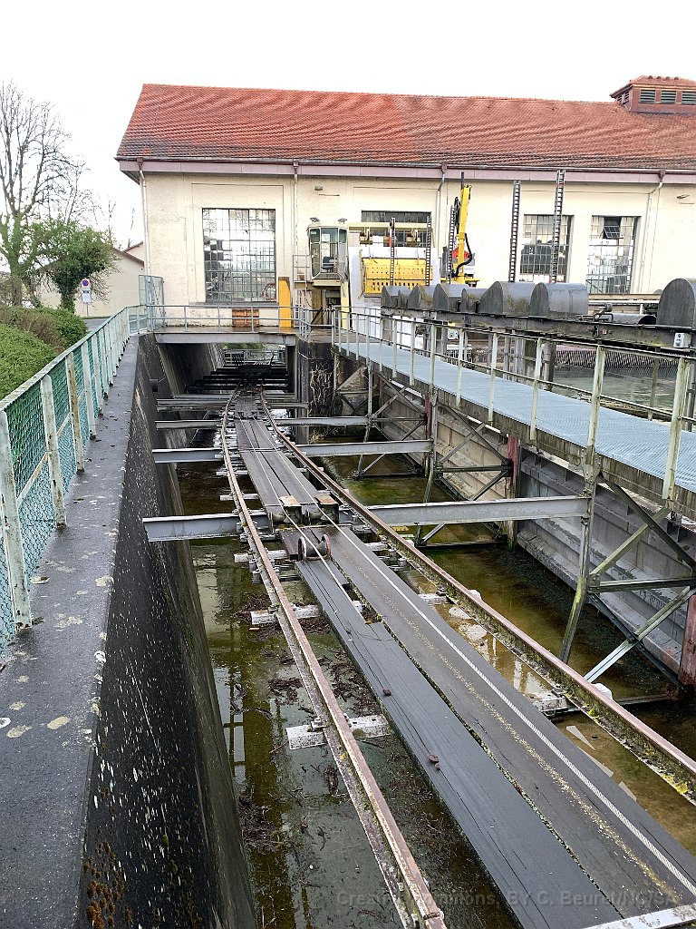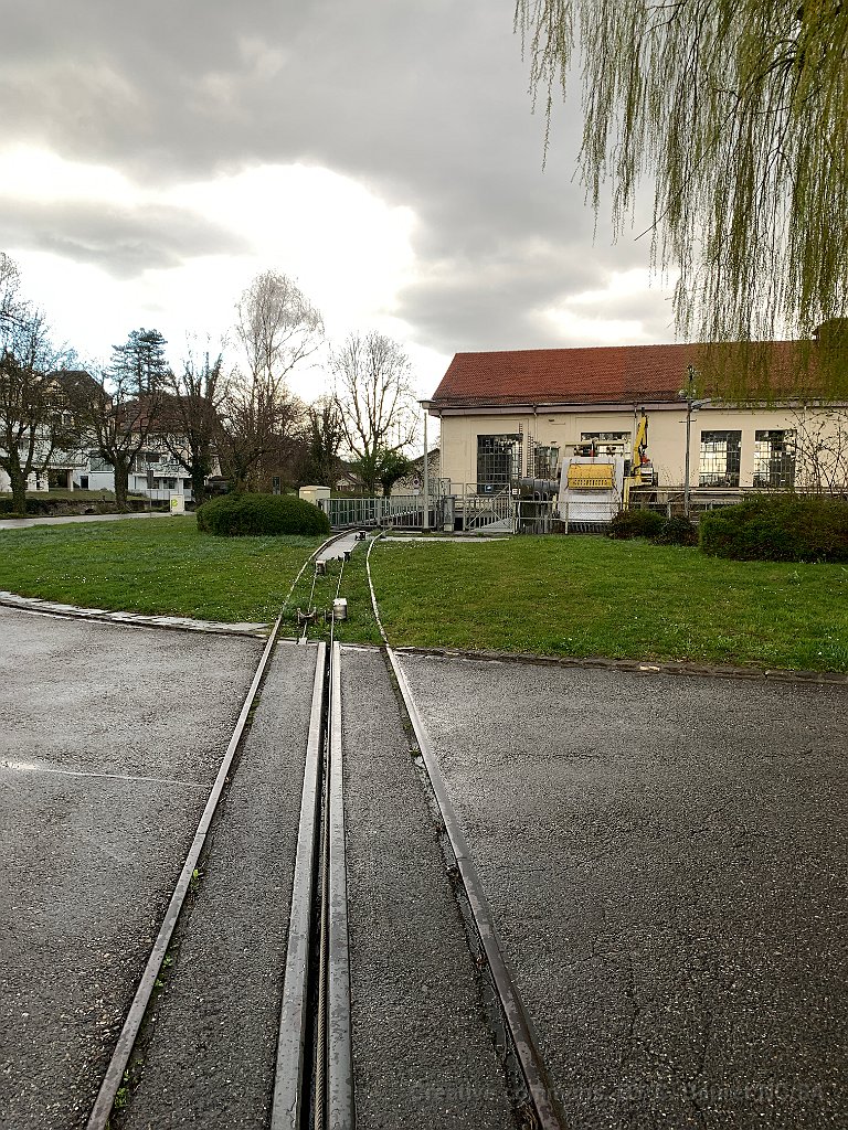 Aarau, usine électrique: des voies et un câble sorte de l'eau en amont du barrage Pour passer une route, le câble tracteur passe dans une sorte de gorge. Le retour du câble est souterrain Détail de poulies. Sous la plaque métallique se trouve le treuil Le tracé passe sous l'usine électrique On voit le chariot pour le transport des bâteaux QUelques mètres au-dessus  du vide avant de rtrouver la rampe en-dessous du barrage.