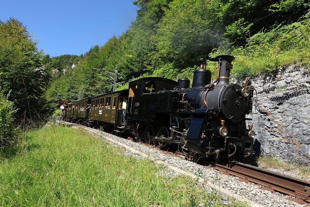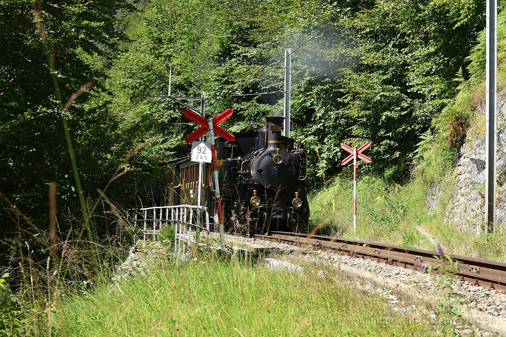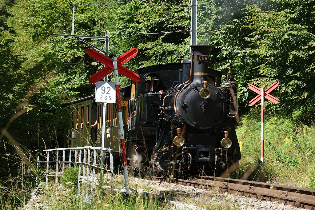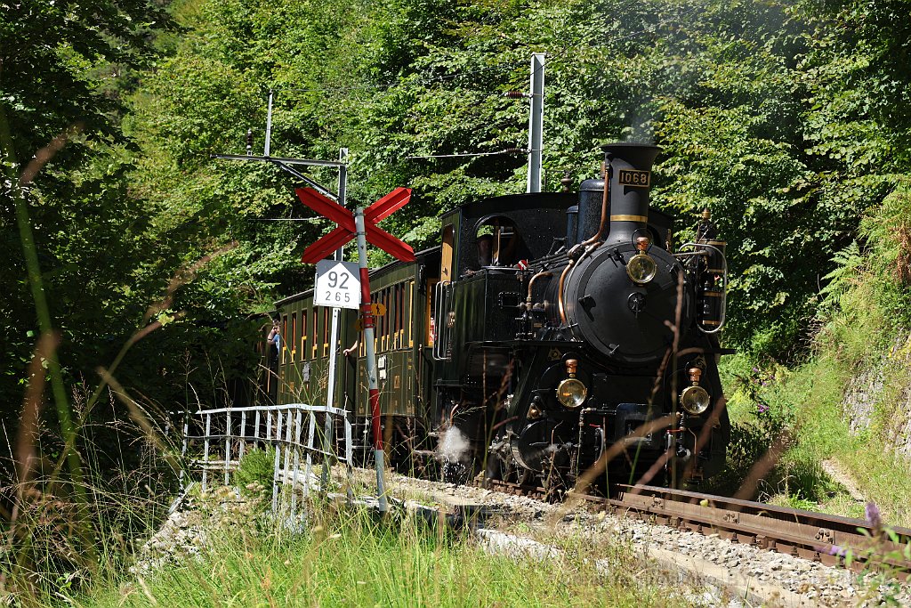 Au lieu-dit Hüsenwald Avec cette fois le focus sur les herbes du premier plan HG 3/4 1068 Avec une rame de voitures anciennes La HG 2/4 1068 dans la descente La première v est la BC3 28.