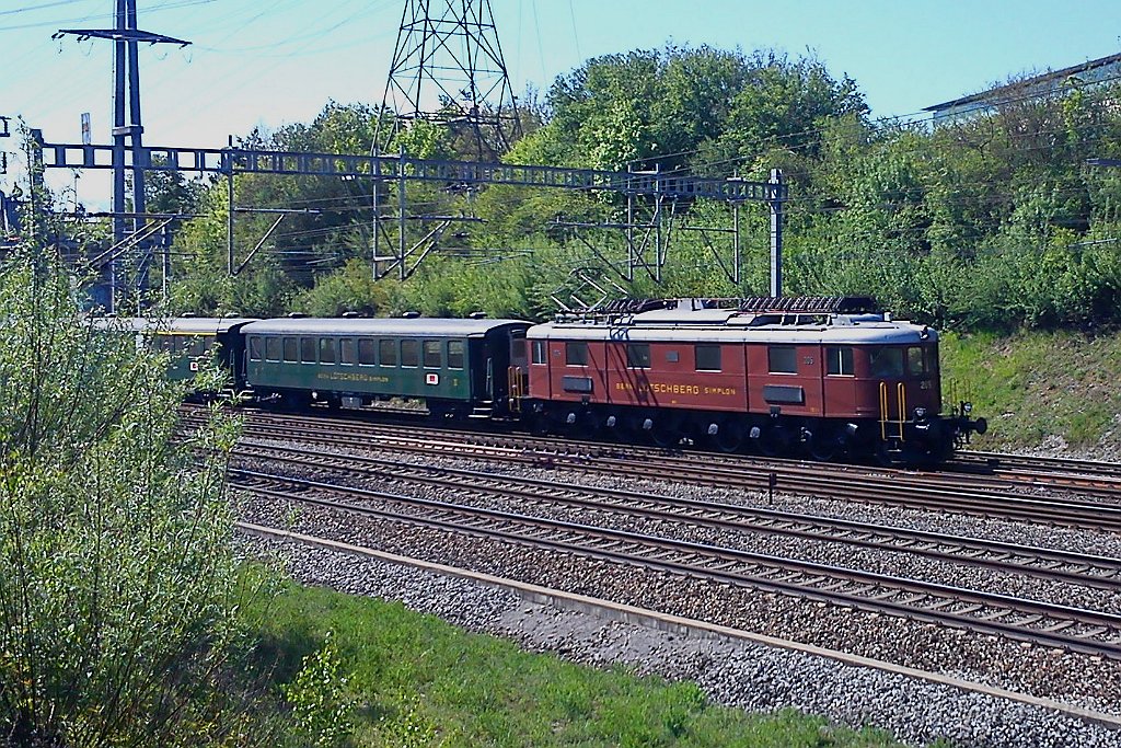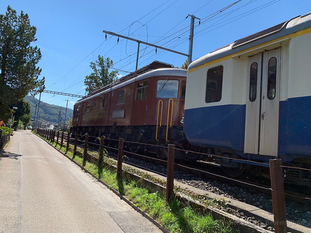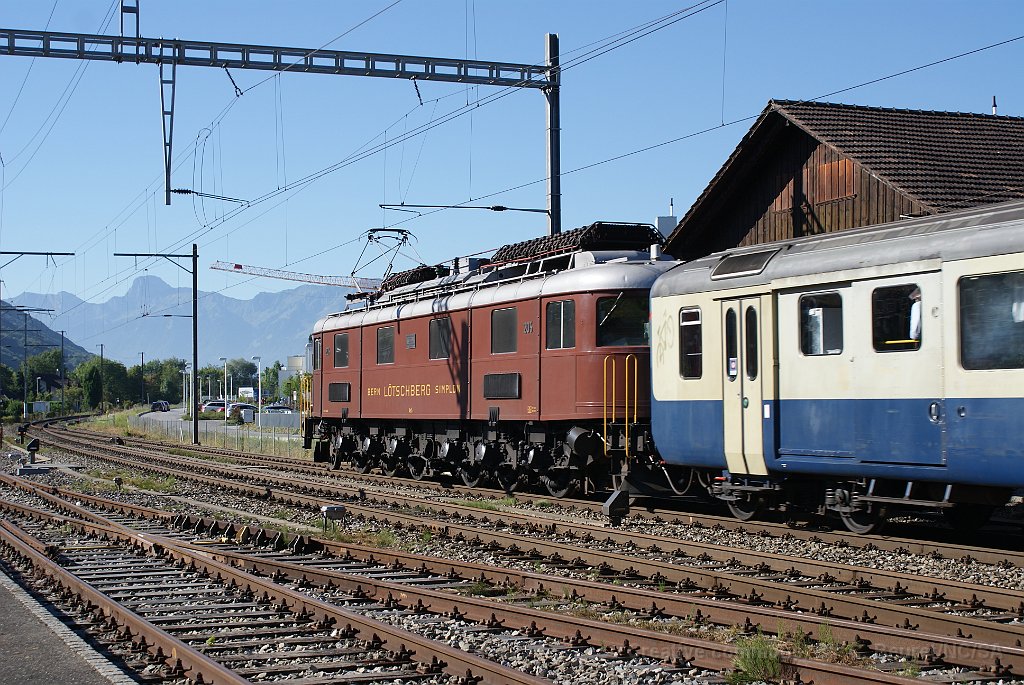 La 205 peu avant Uetendorf Vue latérale de l'Ae 6/8 205 Le train poursuit sa course direction Uetendorf - Thun - Kandersteg Un samedi en début d'après-midi, les barrières du passage à niveau de Belp se baissent à une heure imprévue... Passage d'un train spécial avec l'Ae 6/8 205 Belp, Ae 6/8 205 avec un train composé de voitures VU I de première classe