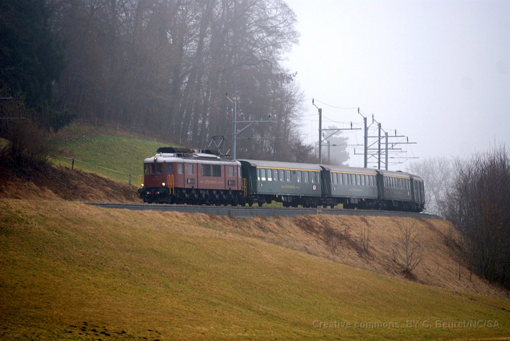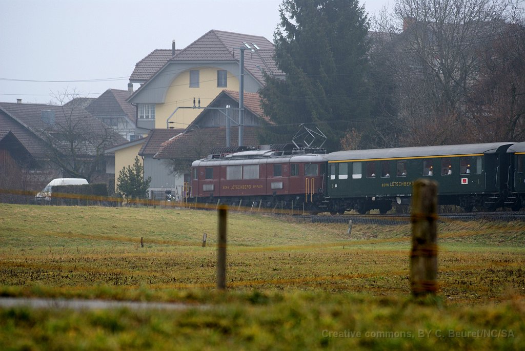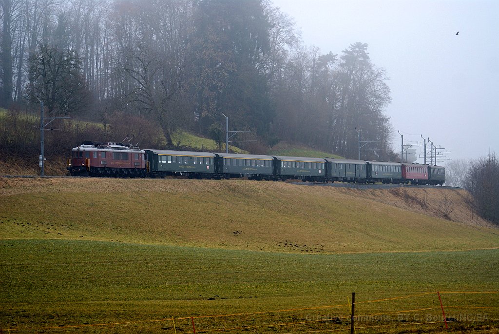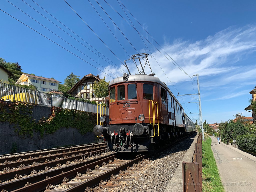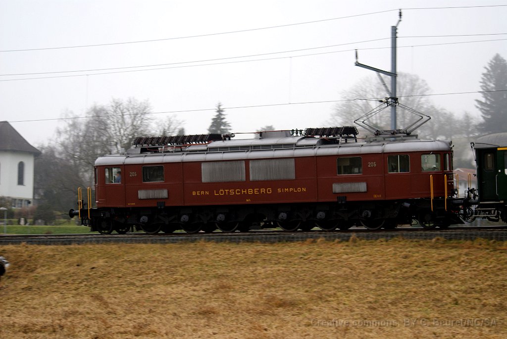 Passage à Belp de l'Ae 6/8 205 La 205 poursuit son voyage en direction du Gürbetal Ae 6/8 205 émergeant du brouillard entre Seftigen et Uetendorf Swiss train Classic à destination de Kandersteg La rame complète entre Seftigen et Uetendorf Ae 6/8 205