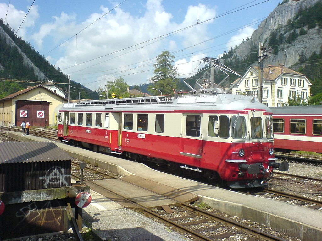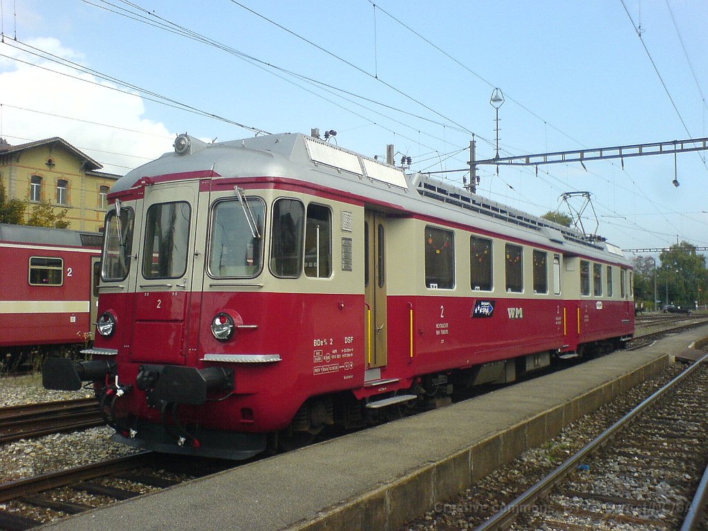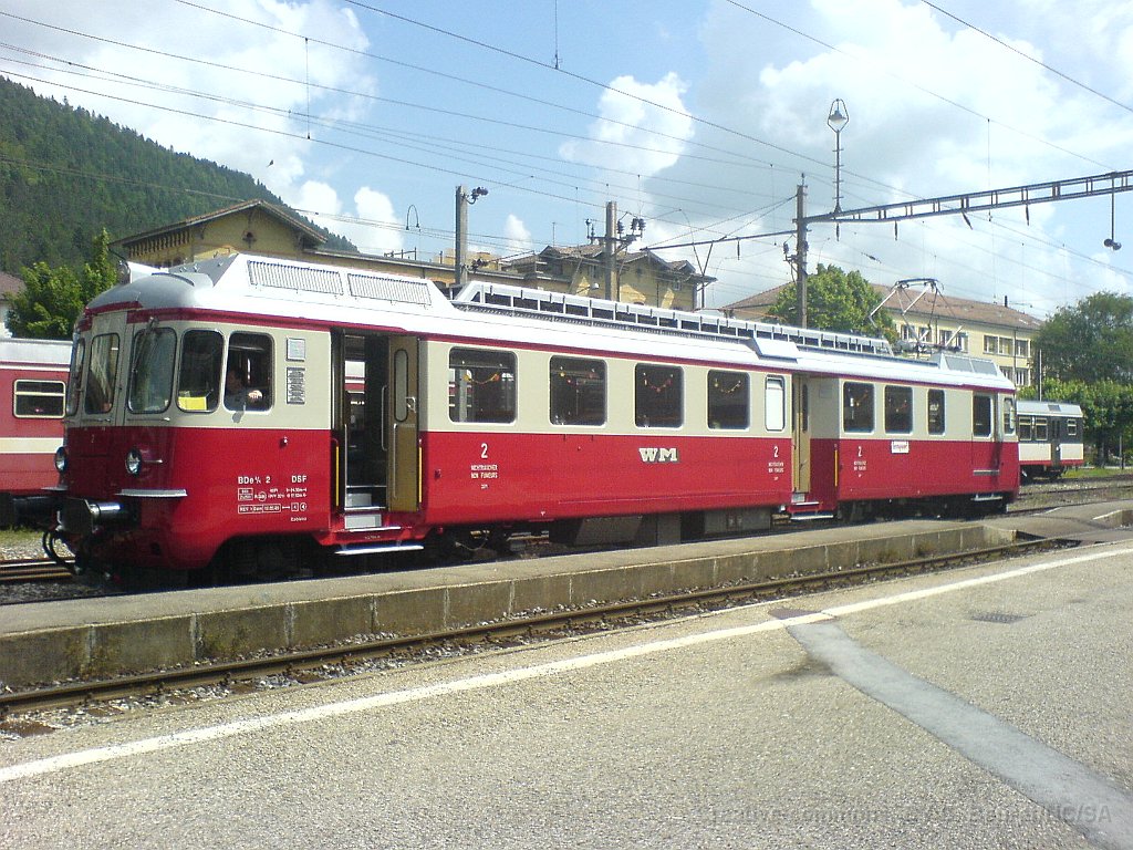 5 BDe 4/4 2 WM remise en état par la Draisinensammlung Fricktal à Fleurier. Automotrice de type EAV, élaborée en collaboration pour et par les entreprises WM, MThB, RVT, MO et GFM, avec le soutien et le financement de l'OFT.