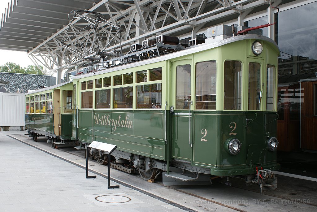 8 Rame du chemin de fer l'Uetliberg avec pantographe décentré pour. Sur la partie commune entre les lignes de l'Uetliberg et du Sihltal, la caténaire du Sihltal en courant continu est au centre, celle en continu de l'Uetliberg décalée.