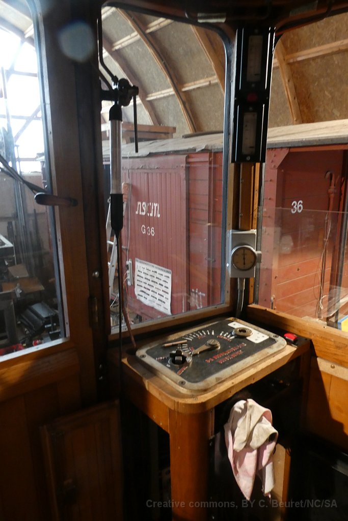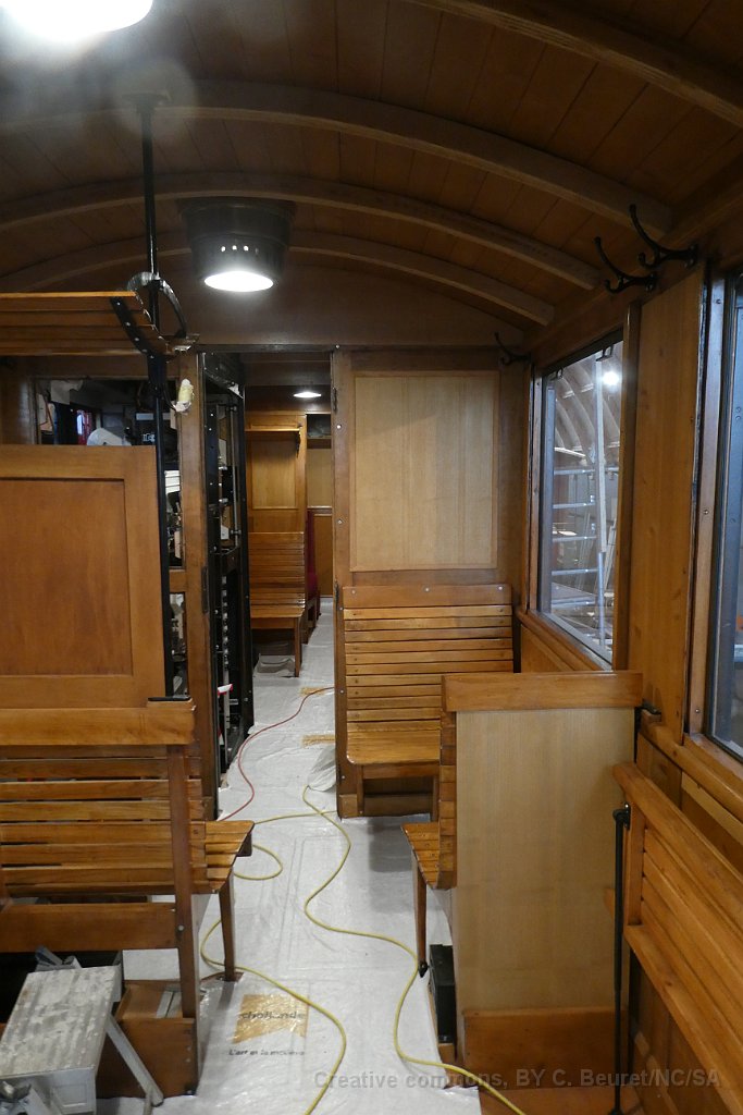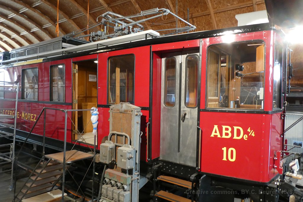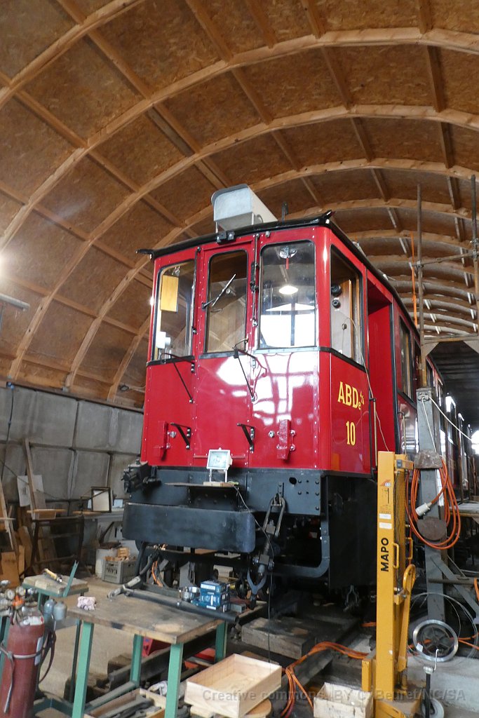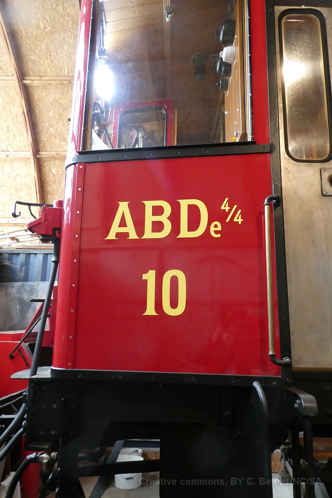 L'automotrice ABDe 4/4 10 en révision Robinets de freins de l'ABDe 4/4 10 Table de commande Partie fourgon postal (à l'origine c'était une BCFZe 4/4) Compartiment de deuxième classe, respectivement au premier plan la partie du fourgon D Le compartiment de première classe avec les sièges refaits