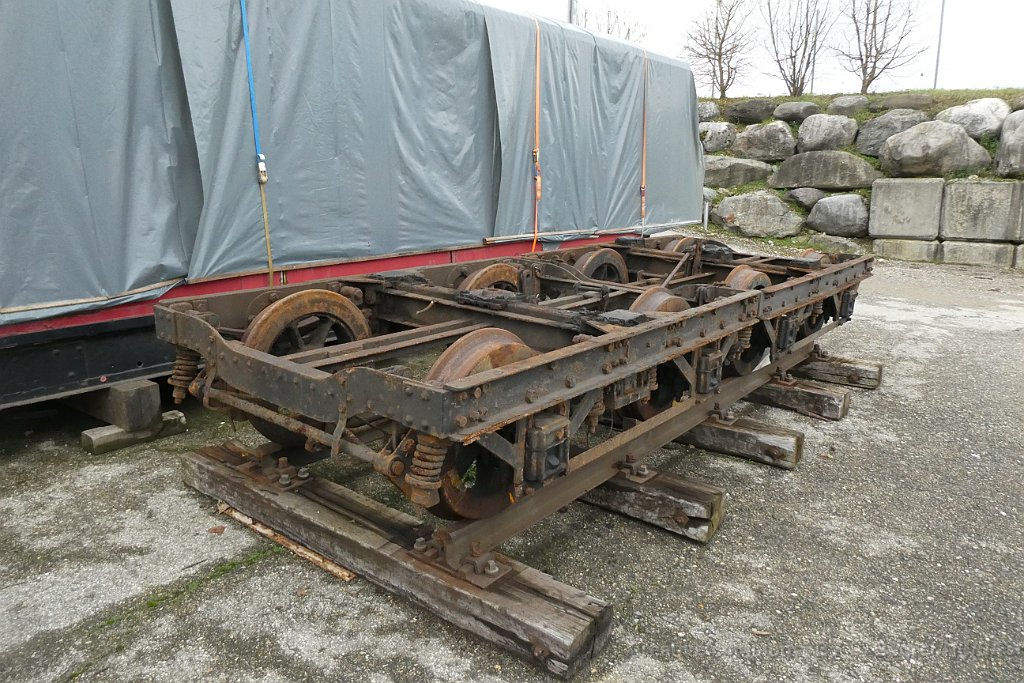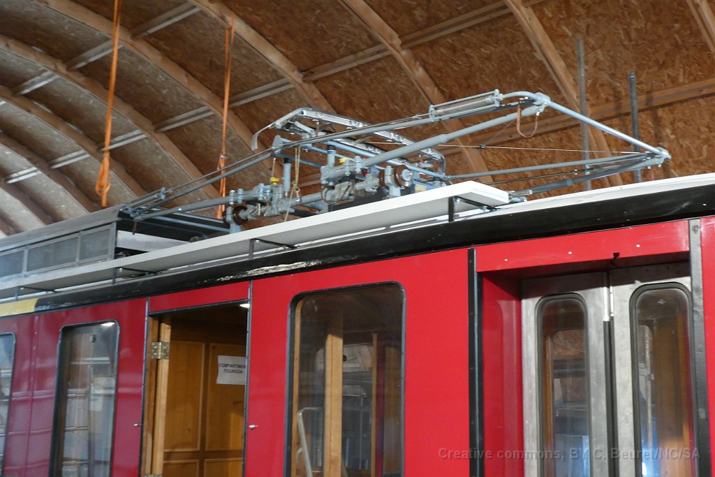 Détail de l'inscription Détail du pantographe L'ABDe 4/4 10 dans l'atelier du NSTCR Dehors, des bogies d'une voiture (sous la bâche) nouvellement rapatriée de La Mure