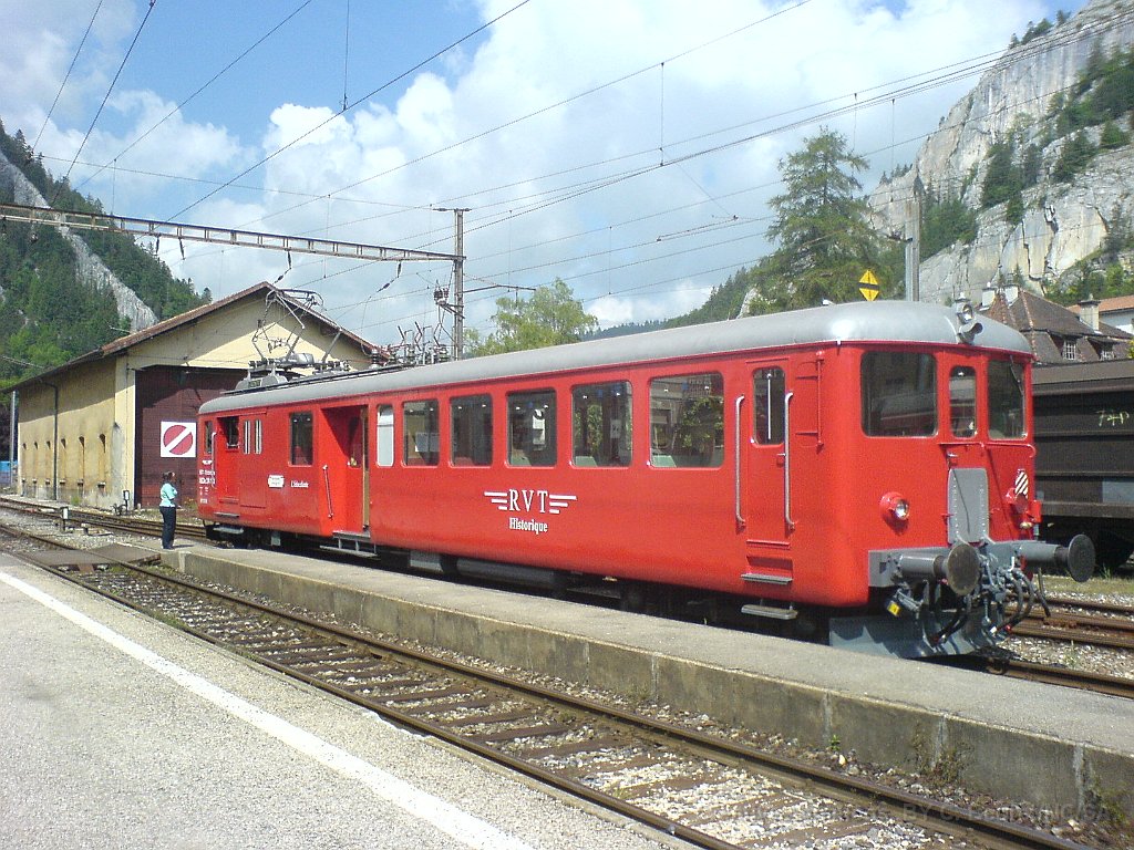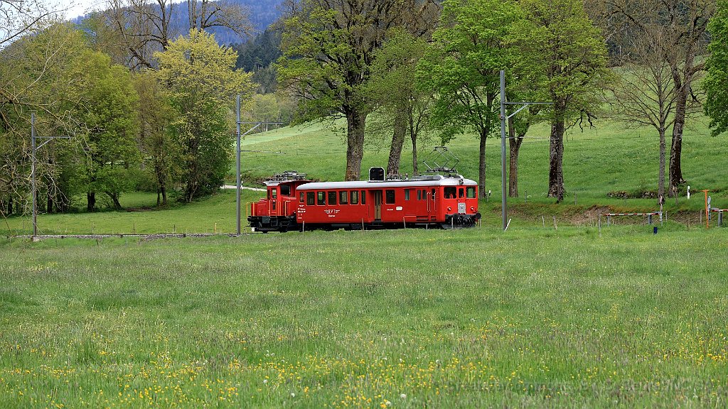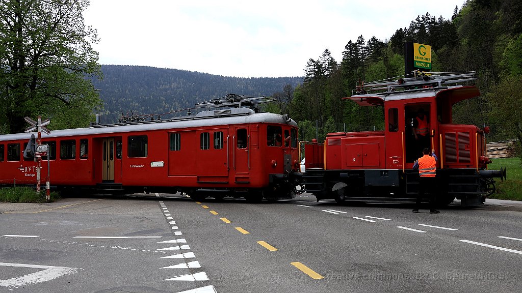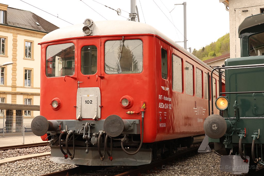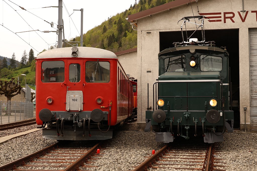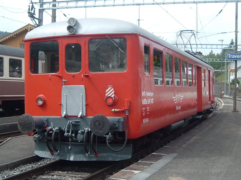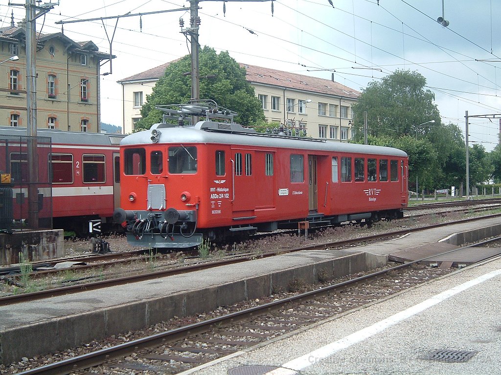 ABDe 2/4 102 Un train composé de la Be 4/4 1 et de la voiture salon descend des Verrières en direction de Travers. Ici entre Boveresse et Couvet Le Tem amène l'ABDe  2/4 102 à Sait-Sulpice sur la ligne non électrifiée du VVT Au passage à niveau à Fleurier, la sécurisation est manuelle L'Etincellante entre Couvet et Môtiers L'Etincellante avec le Tem en remorque arrive à Môtiers