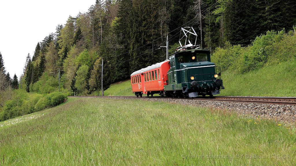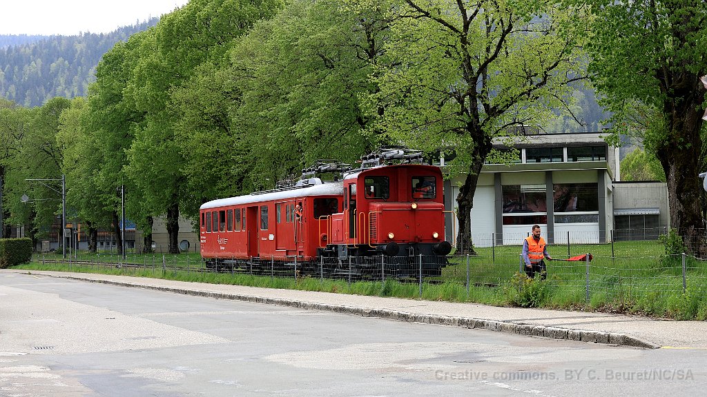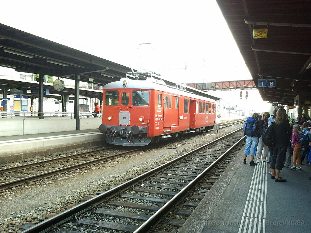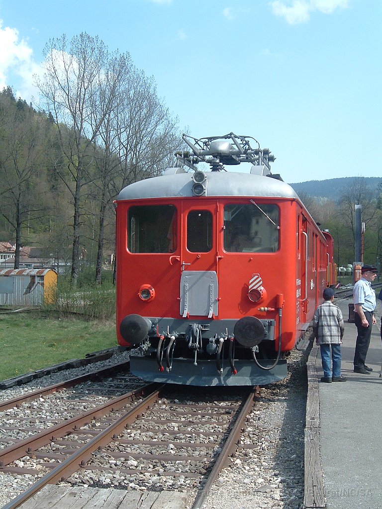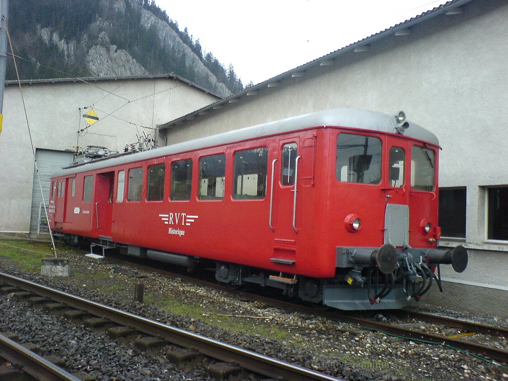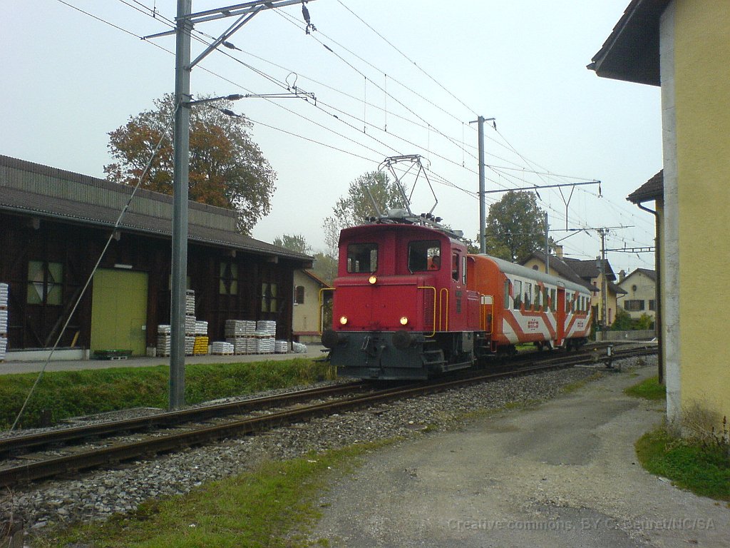 ABDe 2/4 102 Un train composé de la Be 4/4 1 et de la voiture salon descend des Verrières en direction de Travers. Ici entre Boveresse et Couvet Le Tem amène l'ABDe  2/4 102 à Sait-Sulpice sur la ligne non électrifiée du VVT Au passage à niveau à Fleurier, la sécurisation est manuelle L'Etincellante entre Couvet et Môtiers L'Etincellante avec le Tem en remorque arrive à Môtiers