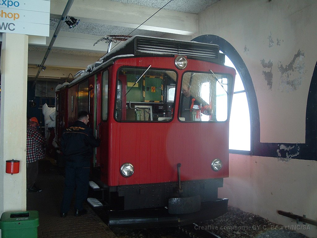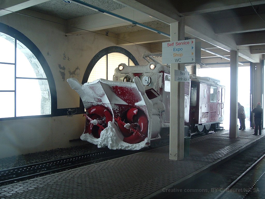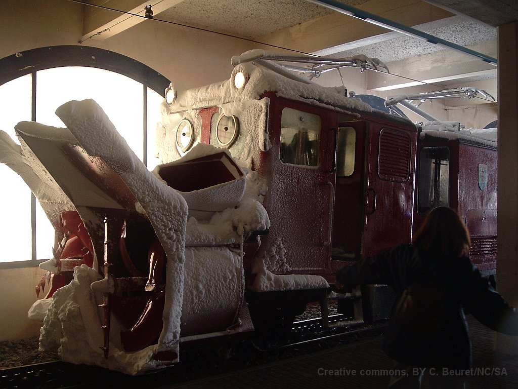 Le chasse-neige (et la délivrance) arrive enfin dans la gare sommitale Après avoir dégagé la voie, le chasse-neige au fonds de la gare des Rochers-de-Naye