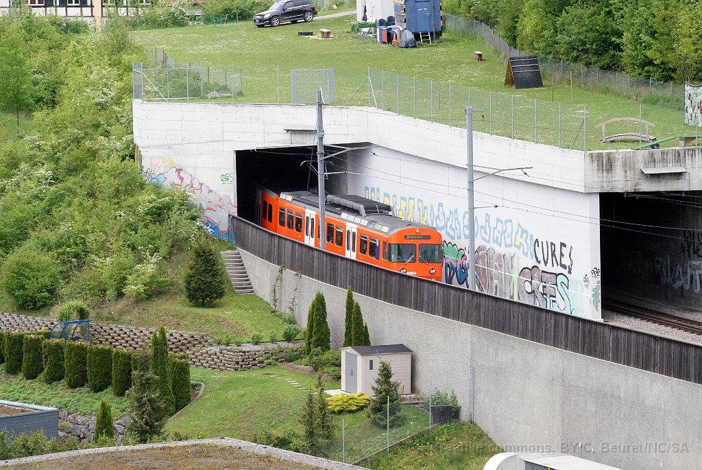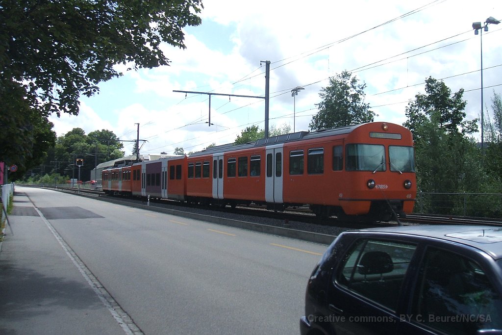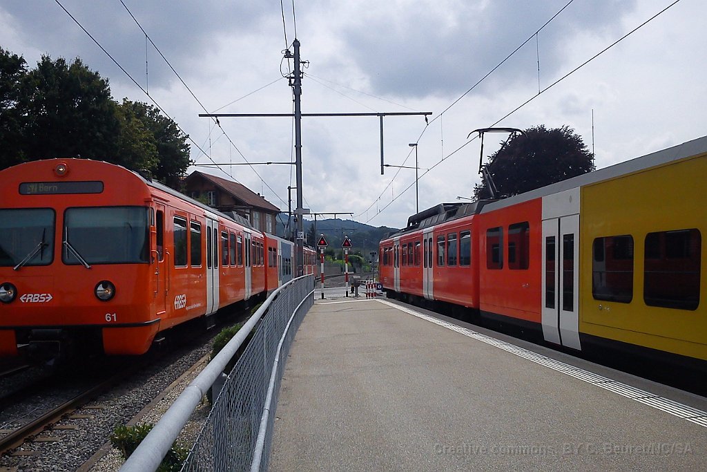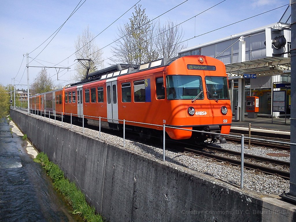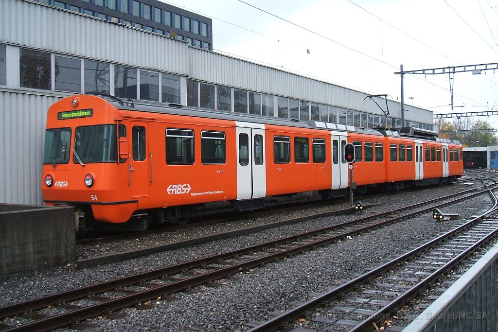 Be 4/8 54. Une des rares Be 4/8 qui n'a pas été transformée en Be 4/12 par l'adjonction d'une voiture intermédiaire. Dépôt de Worblaufen A Worblaufen Be 4/12 59 à Papiermühle Be 4/12 entre Bolligen et Ittigen 7.08.2012: cela fait aujourd'hui 6 ans que la double voie Bolligen-Ittigen est en service S7 sur le passage à niveau à Bolligen