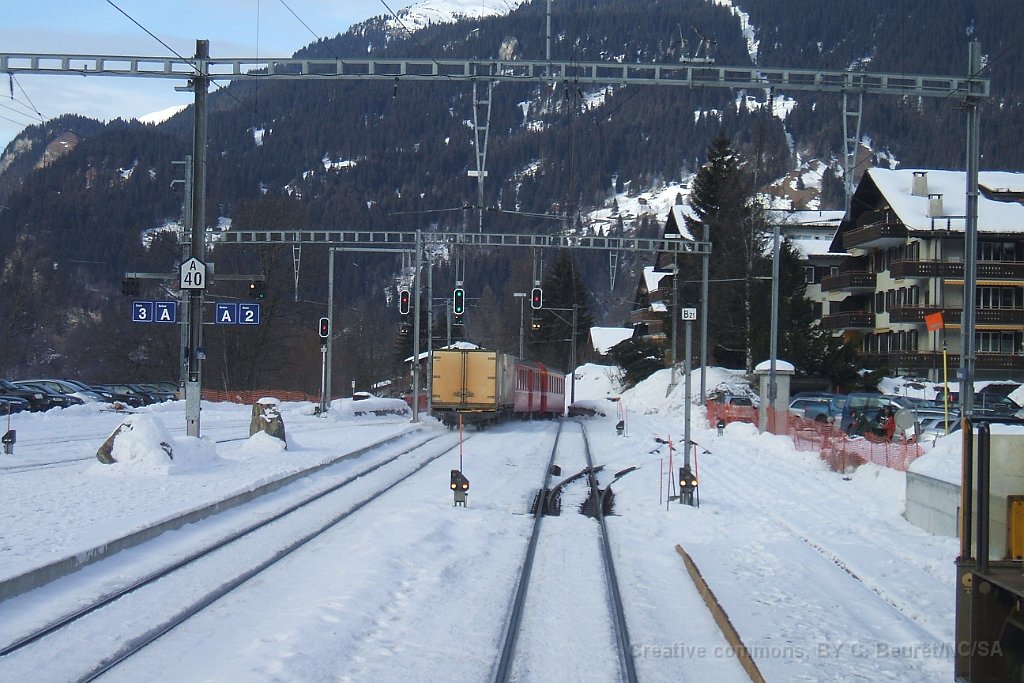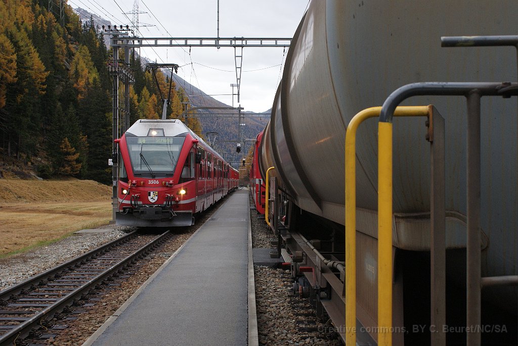 37 Pontresina: le Régio Chur - Tirano qui entre en gare va recevoir le wagon avec le container Coop, livraison vers Poschiavo