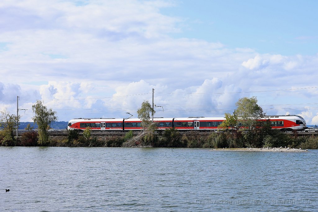 Chur: deux Flirt de dernière génération dans une IR35 Chur - Bern Flirt 3 en queue d'un IR35 au départ de CHur. On voit le traverso à l'avant de la composition- Flirt SOB sur la digue de Rapperswil