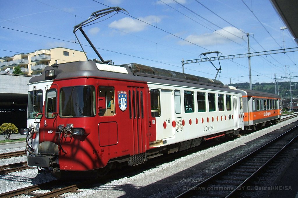 BDe 4/4 142 à Bulle. Il s'agit d'une automotrice de la génération de 1972 avec deux postes de conduite