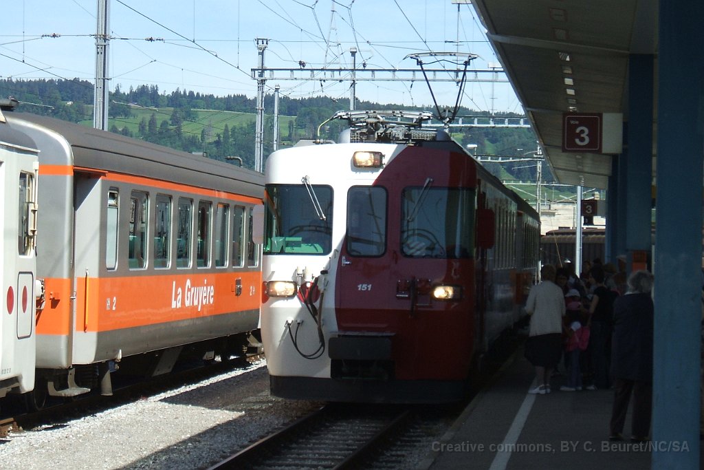 BDe 4/4 151 de la série de 1977 avec un seul poste de conduite Croisement à Gruyère BDe 4/4 152 en attente à Bulle Be 4/4 152 (série 150 avec 1 seul poste de conduite) à Bulle