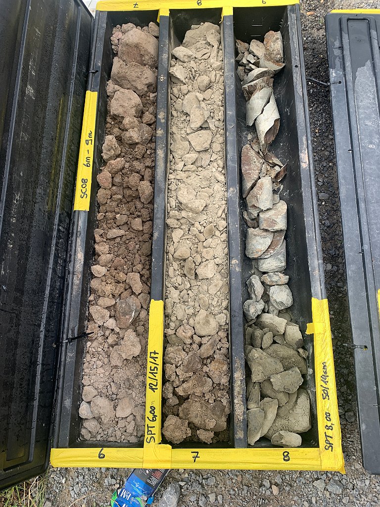 Un carottage rebouché Carottages effectuées sur le parcours du nouveau tunnel Tout n'a pas la même qualité... Tubes pour carottage Quelques dizaines de mètres plus bas passera le train Un autre sondage, cette fois sur le tracé du funiculaire