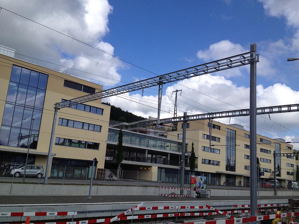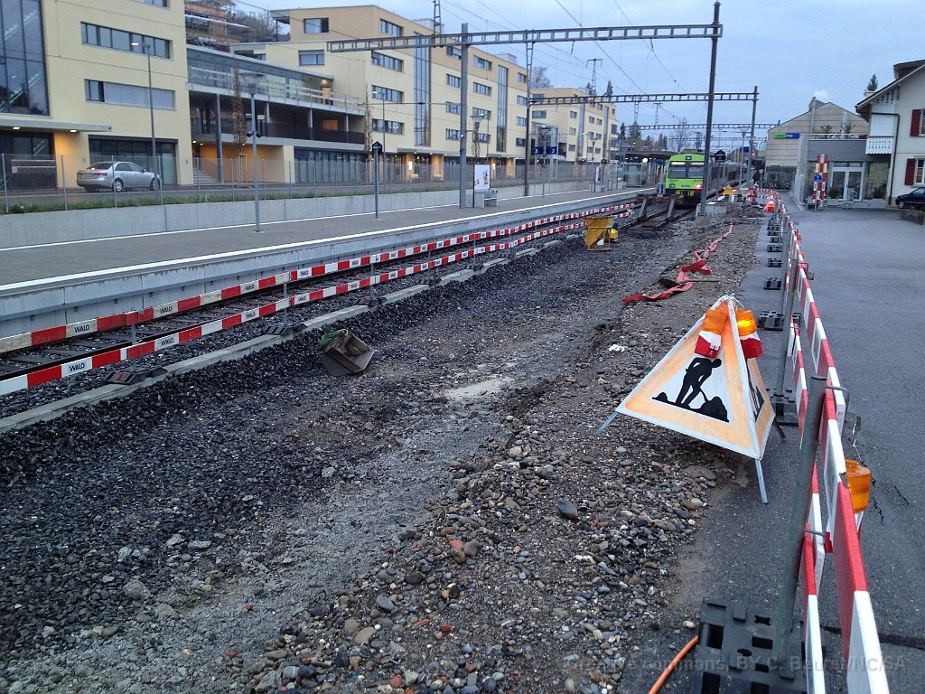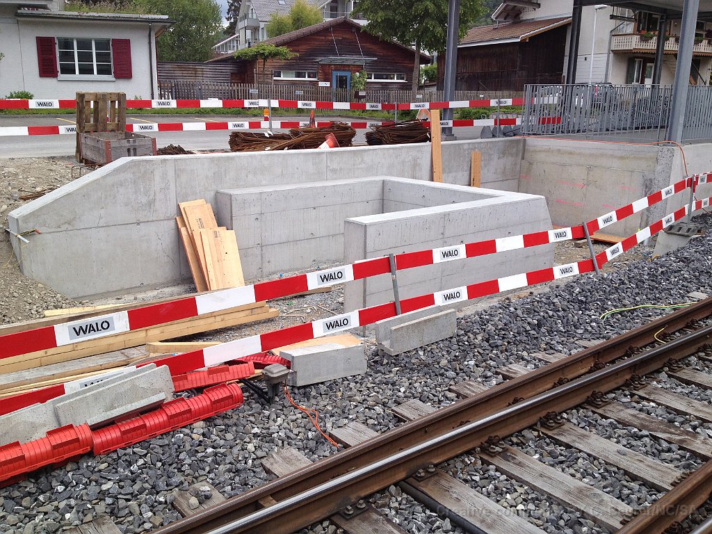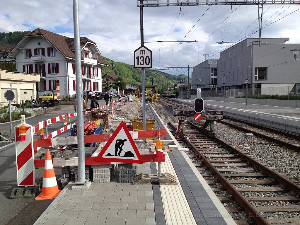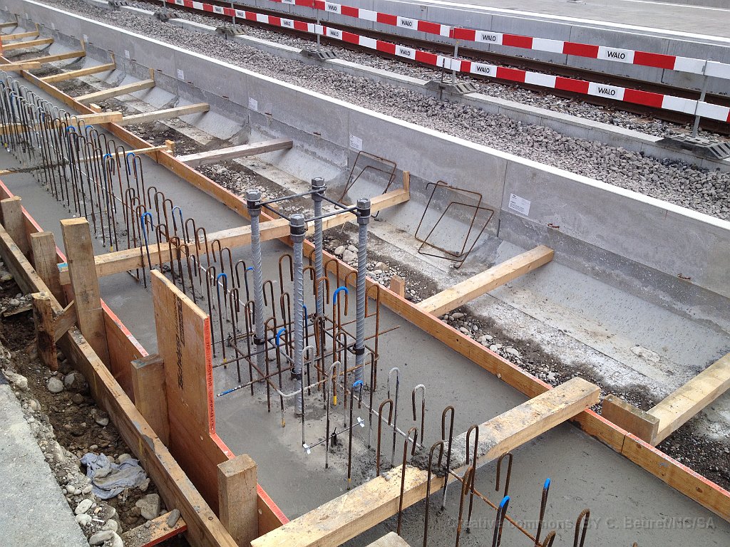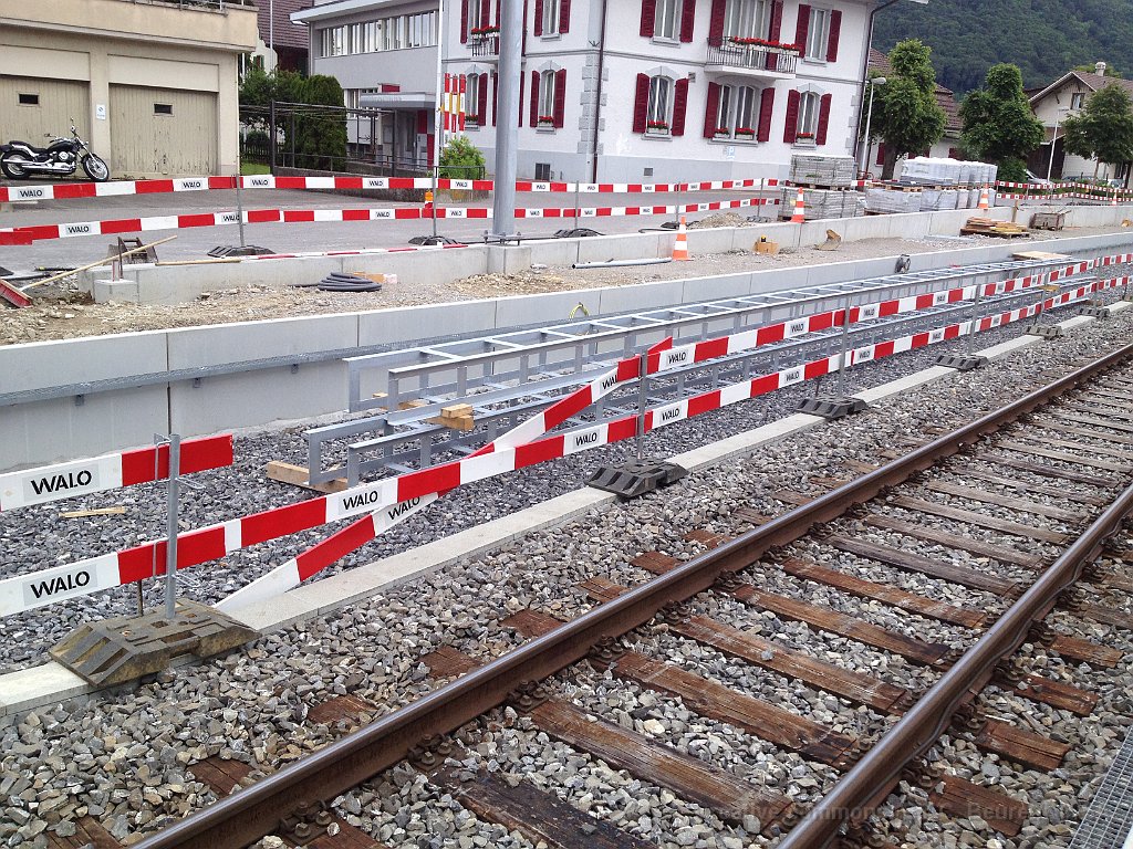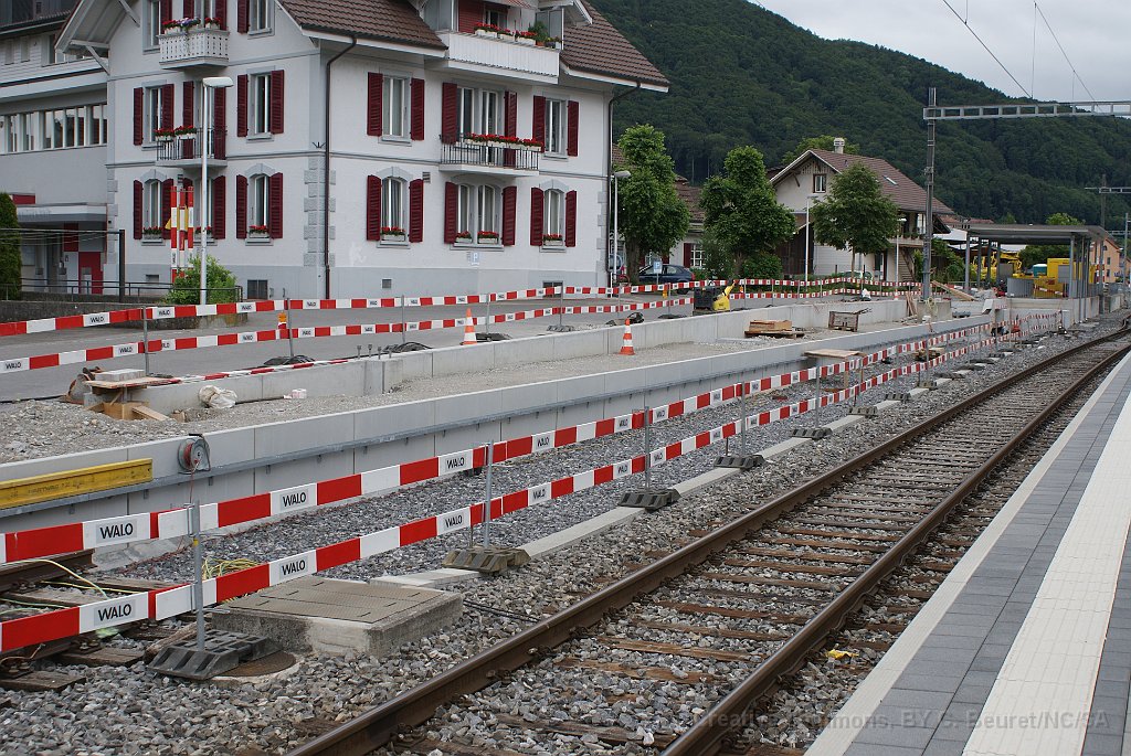 La bordure de quai est déjà posée sur une grande partie de la longueur. Dalle et préparatifs pour le nouveau mur de soutènement et emplacement d'un futur mat de la LC. Bloc de béton dans lequel viendra la matière d'absorbtion de choc derrière le butoir. Le nouveau quai est déjà rempli de chaille. Traversées pour les nouveaux portiques de caténaire Nouveau portique mis en place durant la nuit du 25 au 26.06.2013.