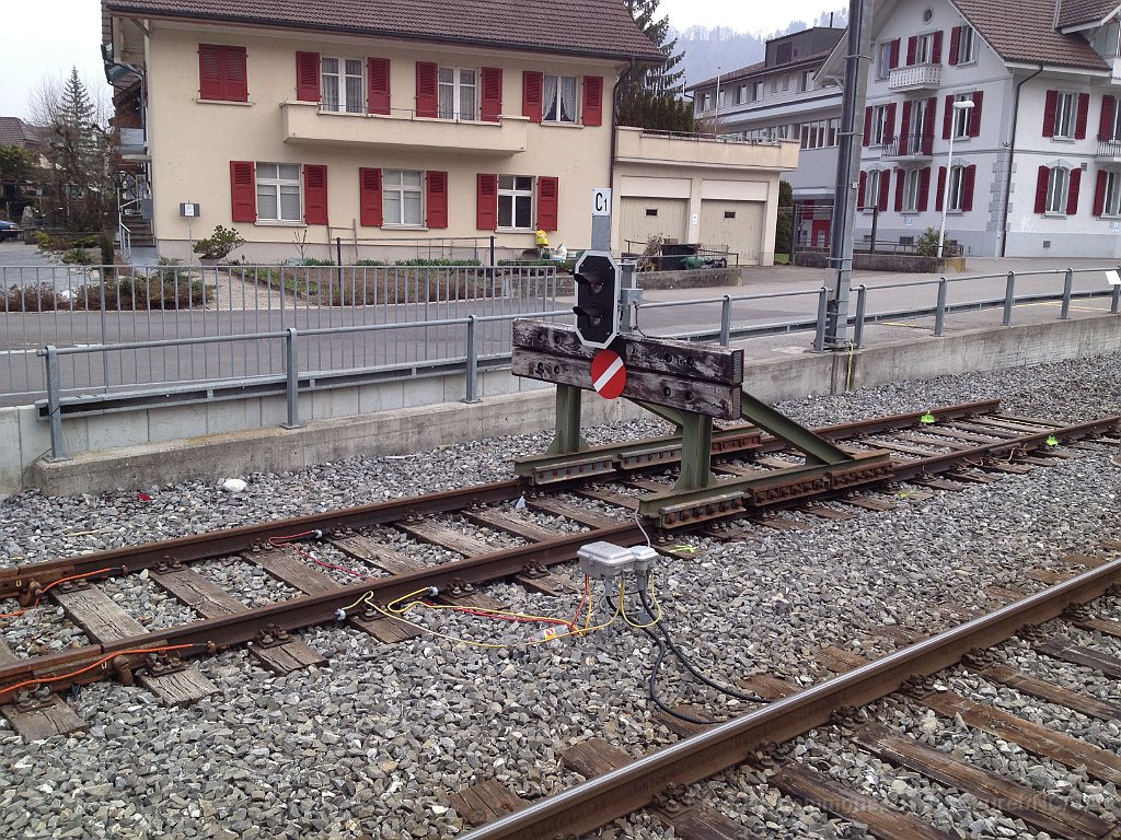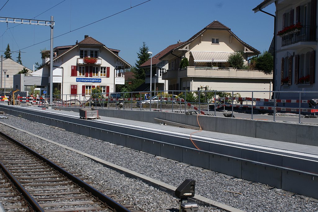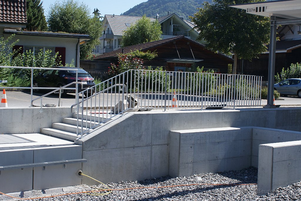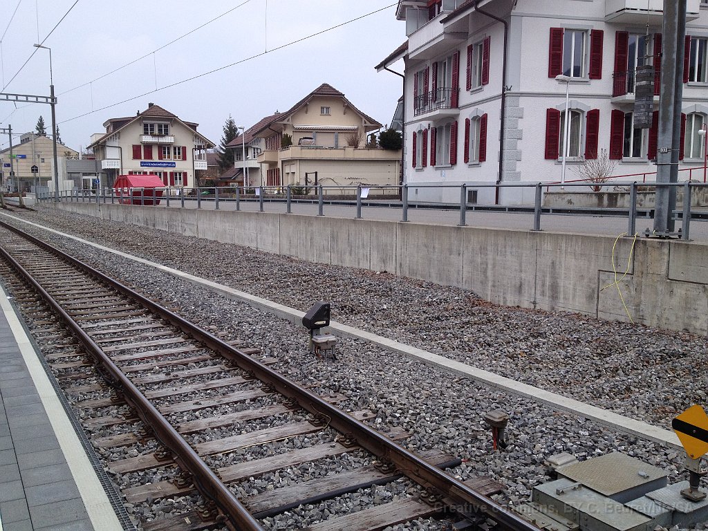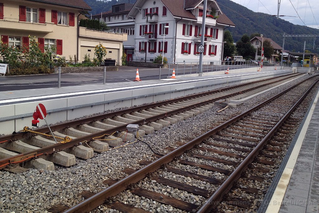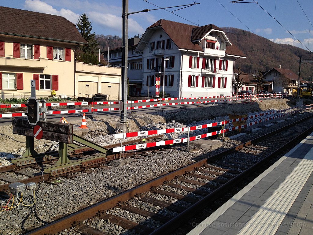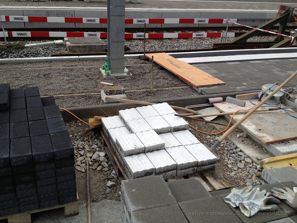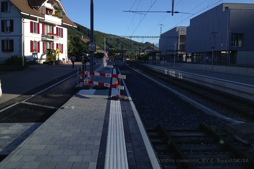 La bordure de quai est déjà posée sur une grande partie de la longueur. Dalle et préparatifs pour le nouveau mur de soutènement et emplacement d'un futur mat de la LC. Bloc de béton dans lequel viendra la matière d'absorbtion de choc derrière le butoir. Le nouveau quai est déjà rempli de chaille. Traversées pour les nouveaux portiques de caténaire Nouveau portique mis en place durant la nuit du 25 au 26.06.2013.