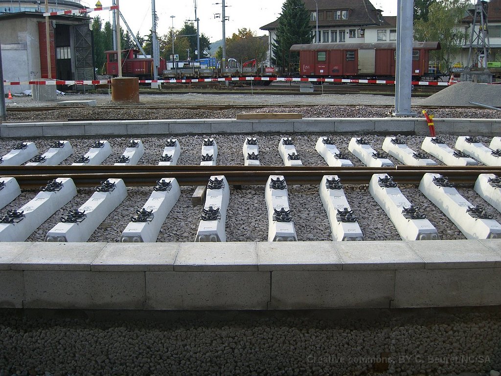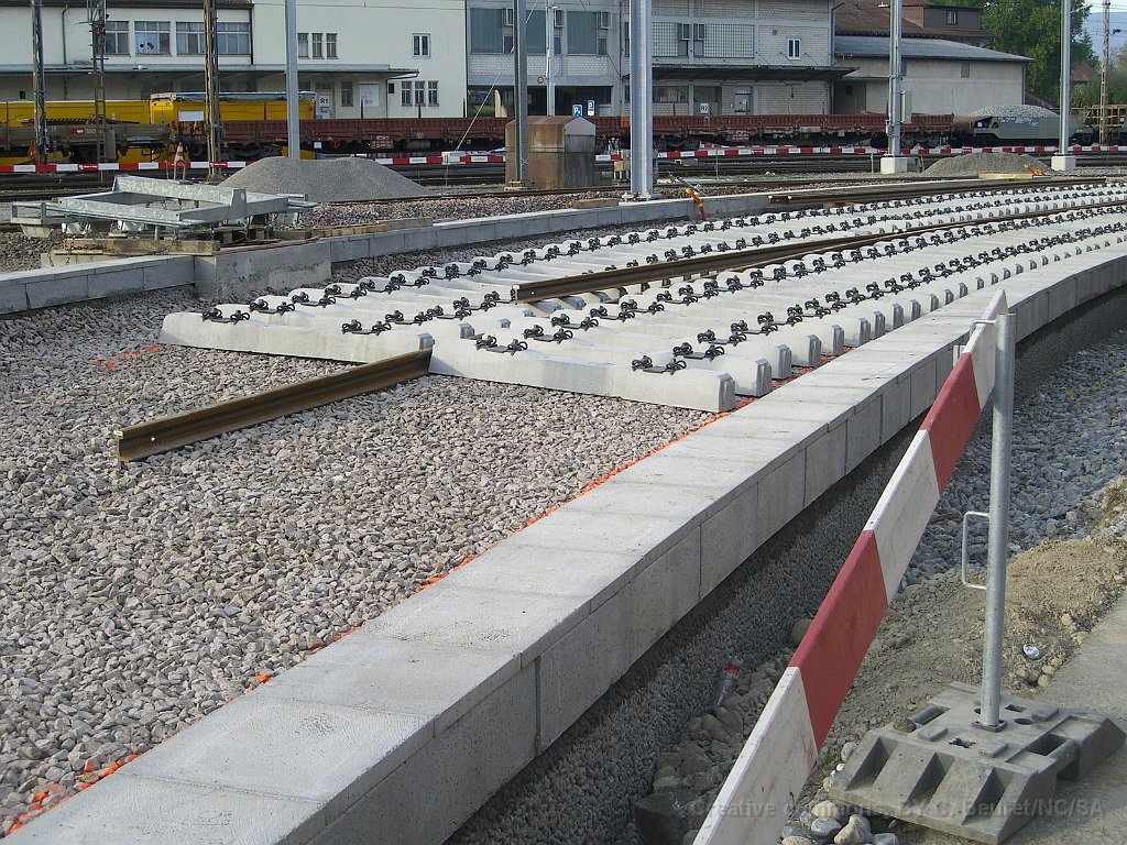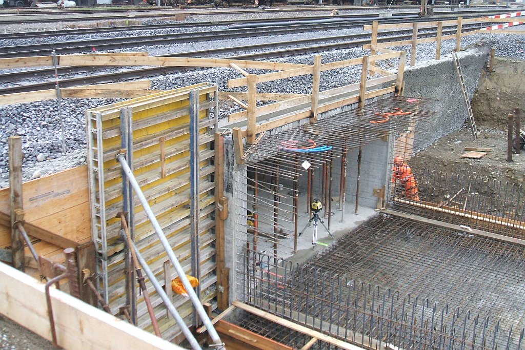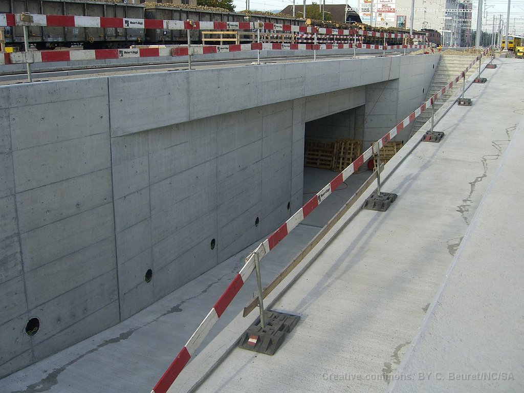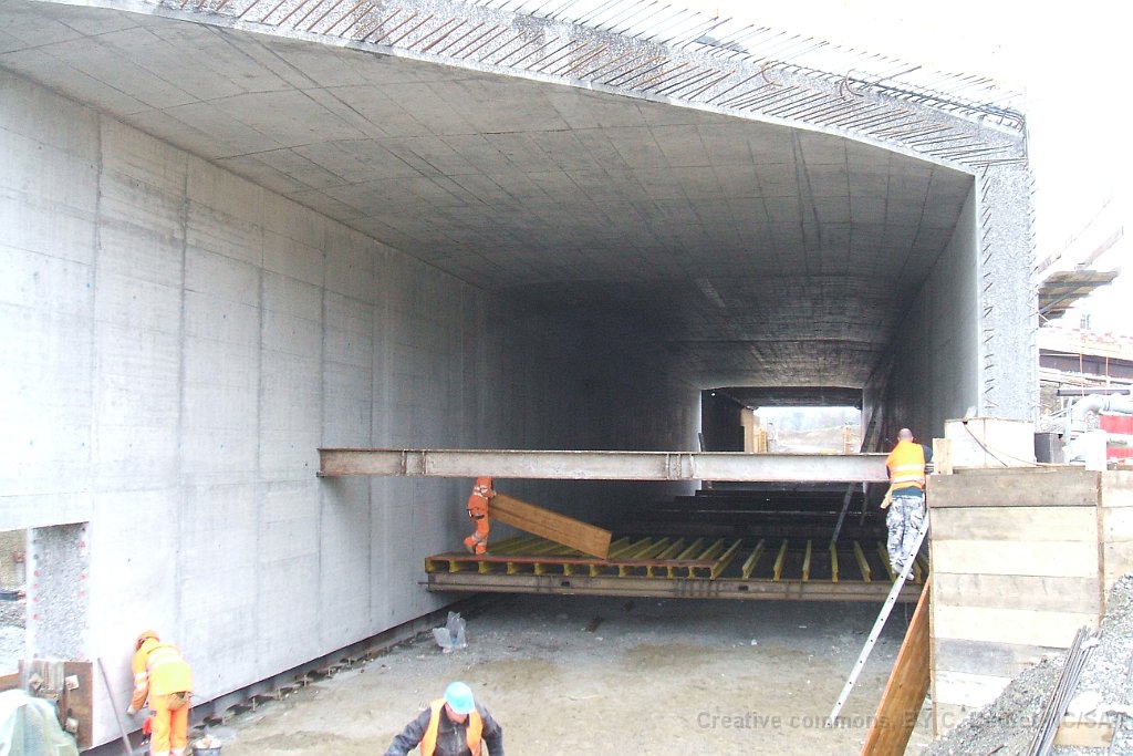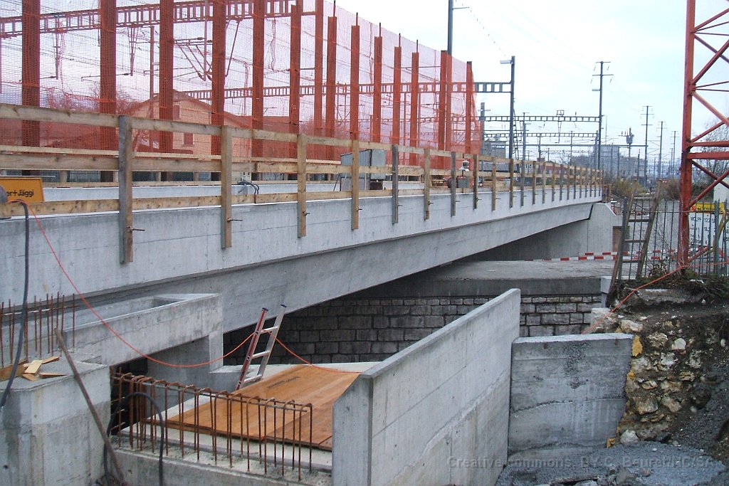 Le bloc de béton du passage sous voie avec renforts pour éviter la déformation lors de son déplacement. Il pèse environ 1500tonnes Rampe d'accès côté gare de Suhr. L'angle dans le mur au premier plan est au niveau maximum de la nappe phréatique Pont provisoire en poutrelles d'acier sous lequel sera glissé la coque en béton du passage sous-voie Ligne CFF vers Lenzburg sur le pont provisoire. La ligne est maintenue en place par des profilés acires en L soudés. Passage sous-voie à la gare de Suhr Suhr, traverses posées sur le tracé à l'entrée depuis Aarau