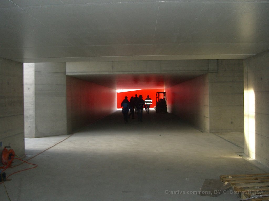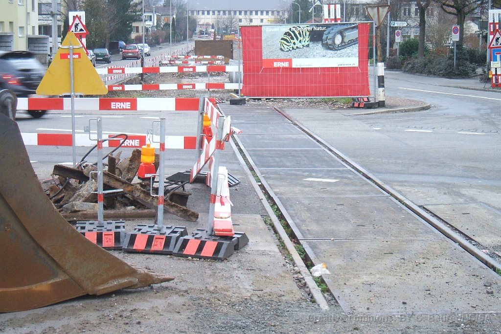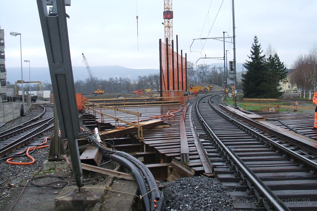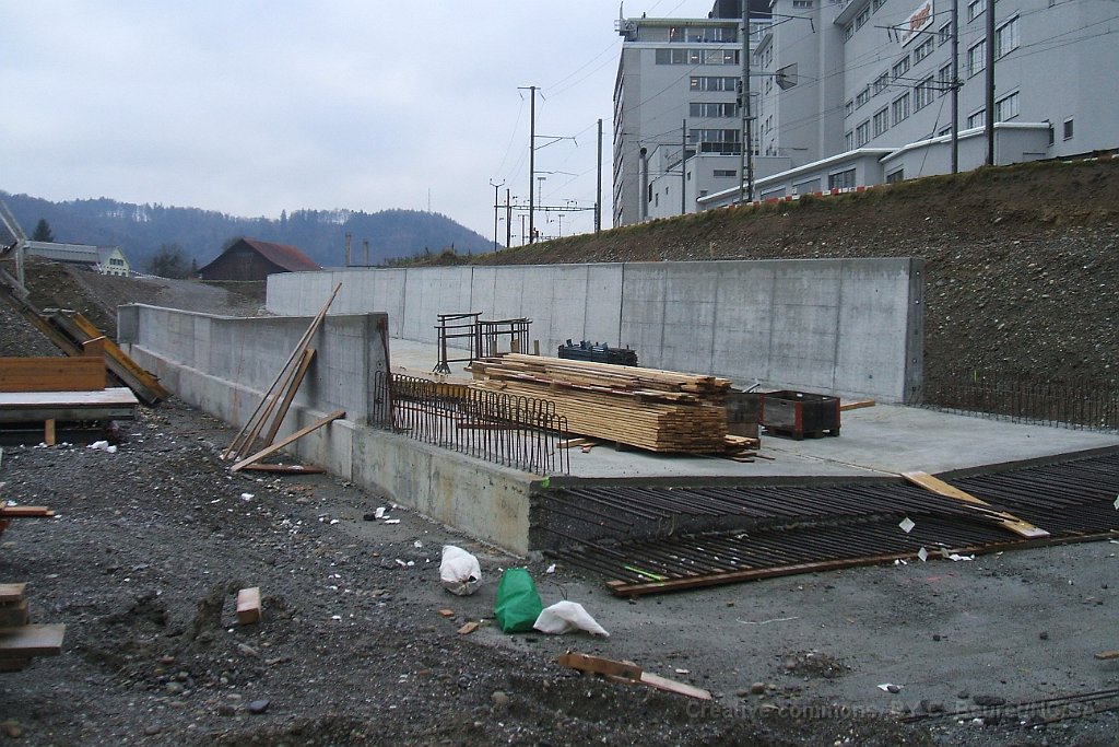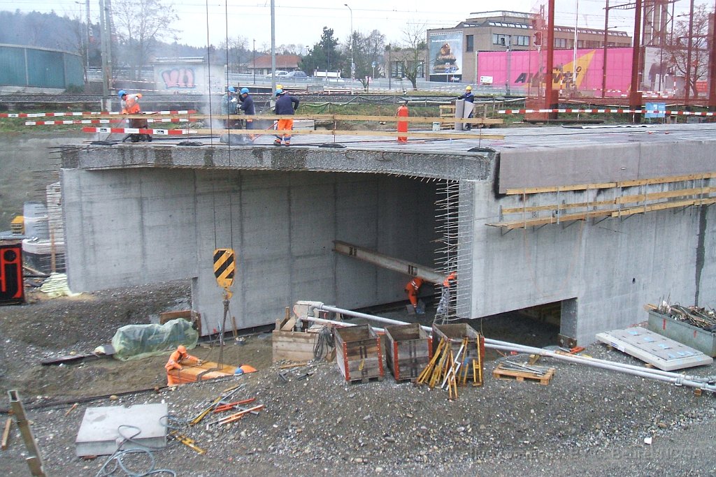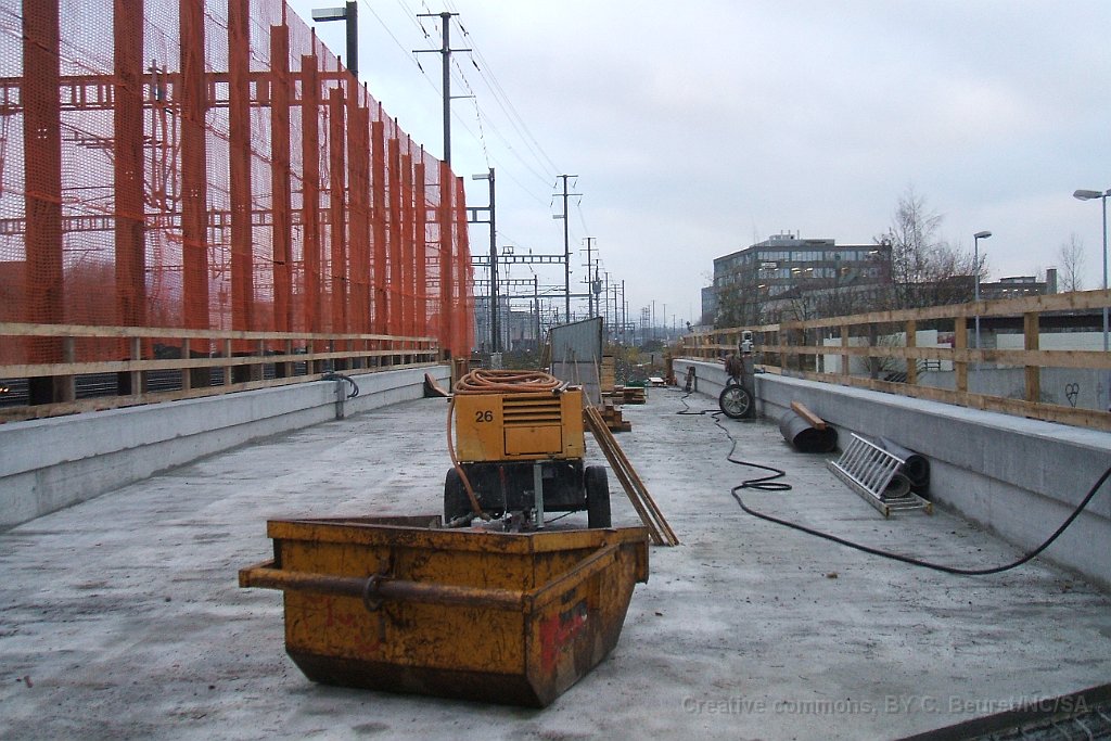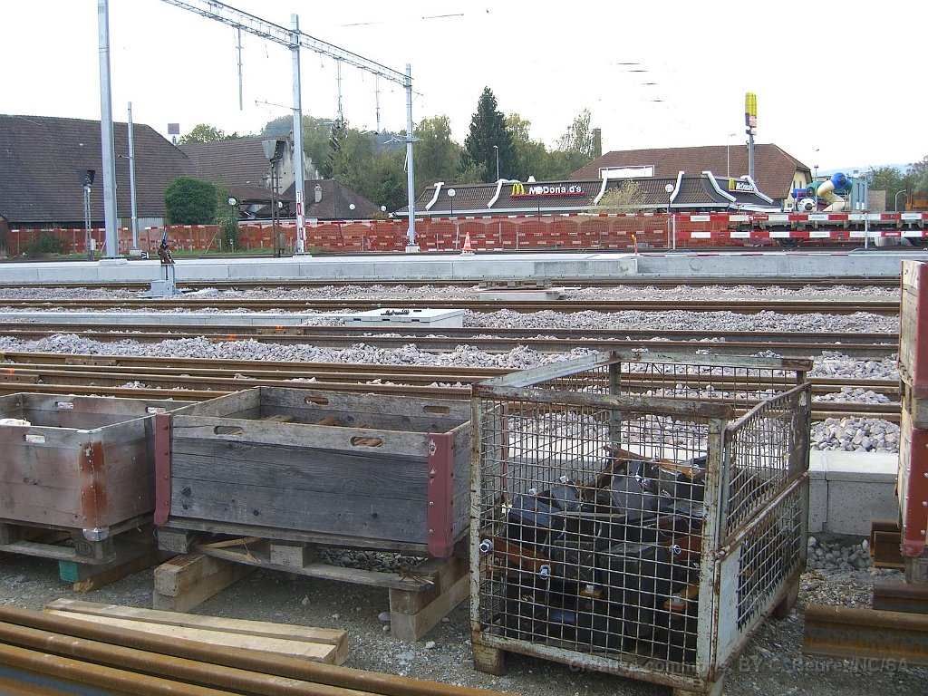 Le bloc de béton du passage sous voie avec renforts pour éviter la déformation lors de son déplacement. Il pèse environ 1500tonnes Rampe d'accès côté gare de Suhr. L'angle dans le mur au premier plan est au niveau maximum de la nappe phréatique Pont provisoire en poutrelles d'acier sous lequel sera glissé la coque en béton du passage sous-voie Ligne CFF vers Lenzburg sur le pont provisoire. La ligne est maintenue en place par des profilés acires en L soudés. Passage sous-voie à la gare de Suhr Suhr, traverses posées sur le tracé à l'entrée depuis Aarau