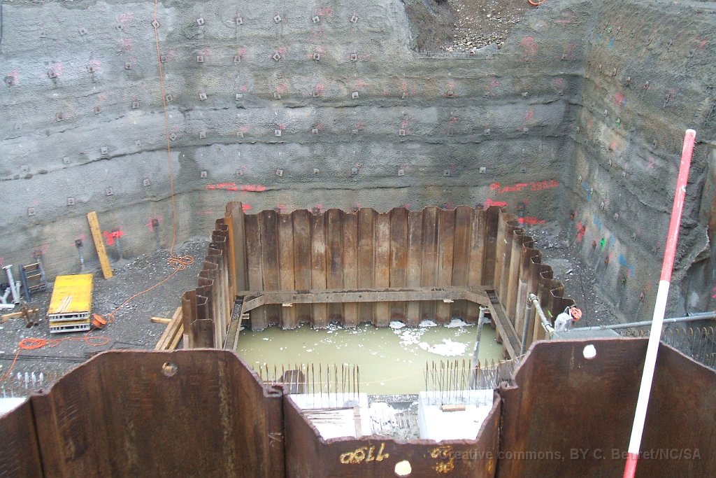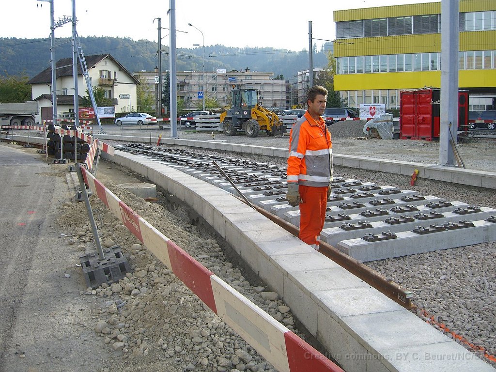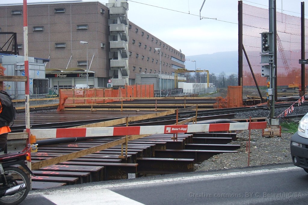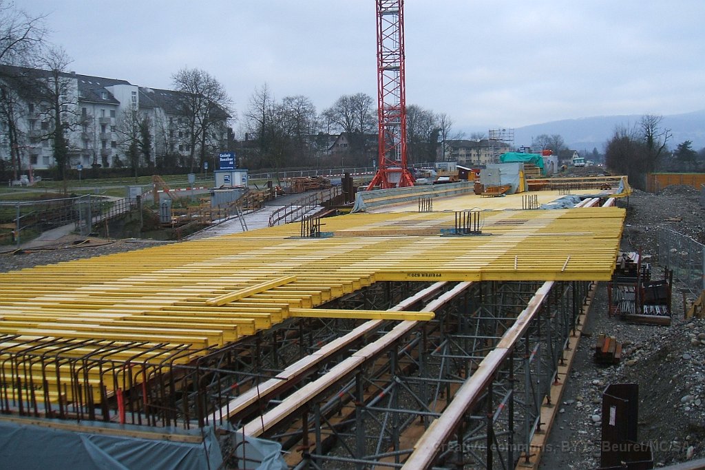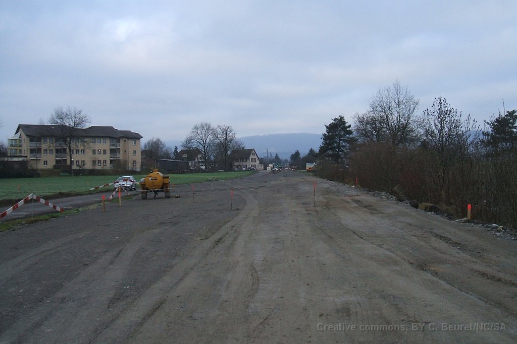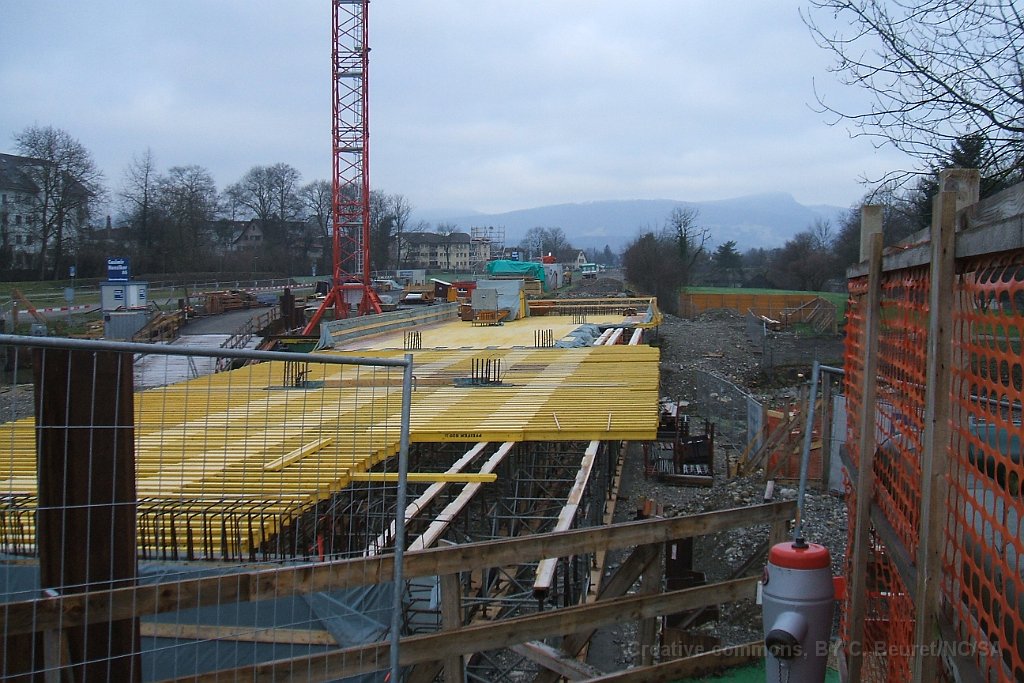 Futur pont sur la Suhre Futur pont sur la Suhre Panneau explicatif des travaux Passage sous la route cantonale et la ligne CFF Lenzburg - Suhr Emplacement des installations de pompage. Le fond du trou est environ 2m50 sous le niveau maximal de la nappe phréatique Bloc de béton du passage sous-voie qui sera poussé à son emplacement définitif par deux gros verrins. On en devine un sous la bâche gris/vert