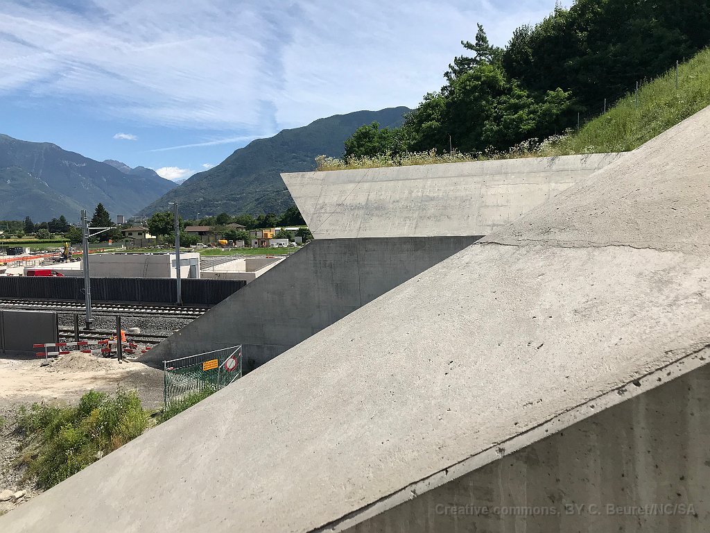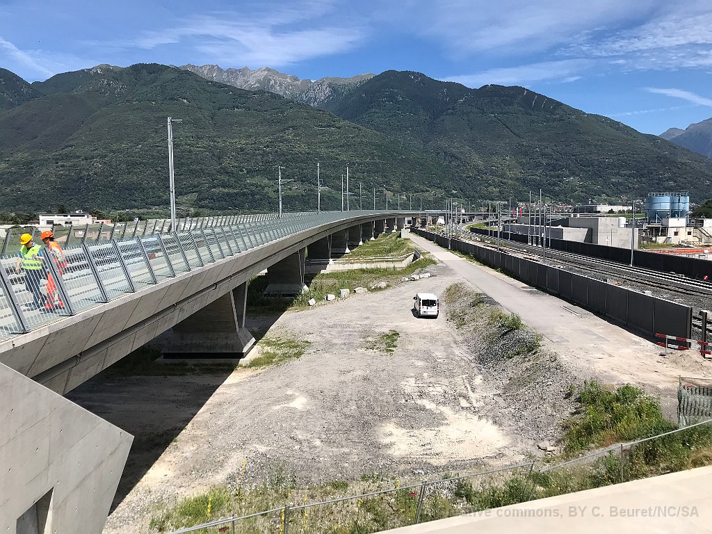 20 De gauche à droite: sur le viaduc la voie Lugano - Bellinzona, la voie Lugano - Locarno, la voie Locarno - Lugano et la voie Bellinzona - Lugano. Les voies de et vers Locarno se rejoindront une fois les travaux finis environ au milieu de l'image, avant de passer sous le viaduc.
