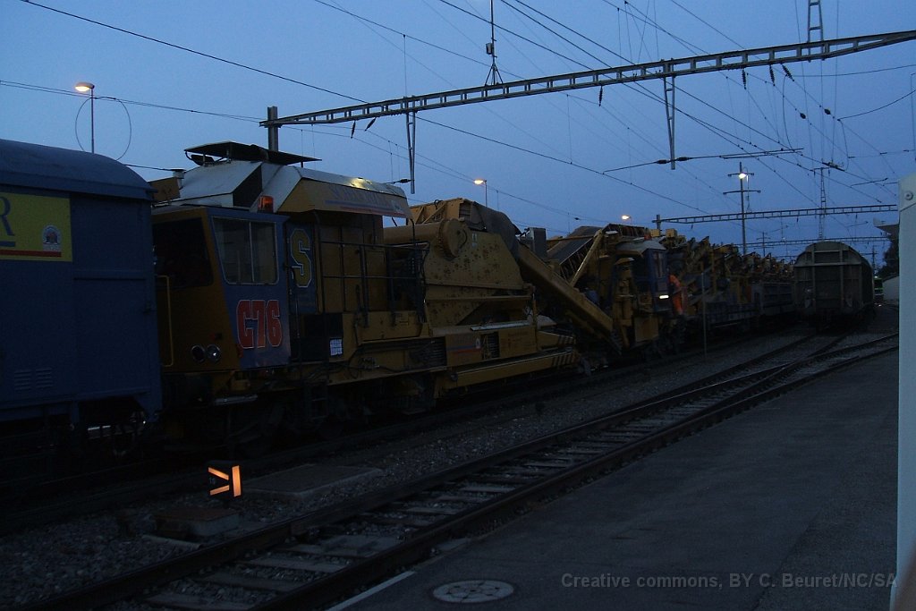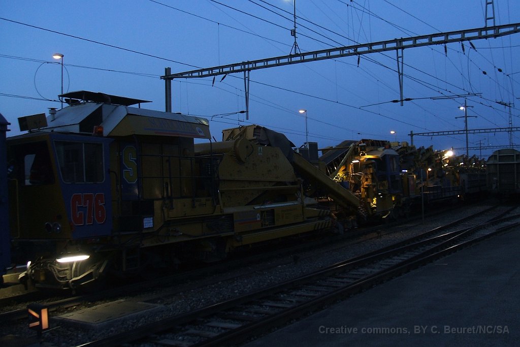 Le même avec éclairage... un petit côté étrange... Train de travaux Scheuchzer - RailPro - Sersa - Vanoli à Ins Bourreuse à Romont Grizzly à Ins Le Grizzly de nuit à Ins Bourreuse de voie BNA 664 à Bern