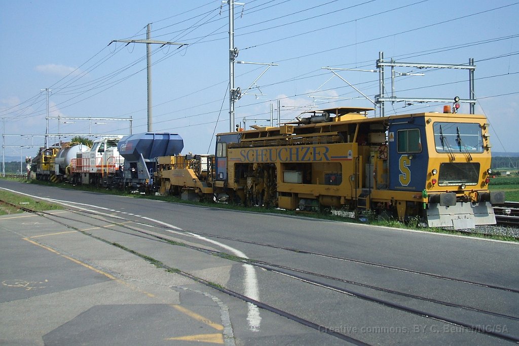 Wagon d'accompagnement du Puma 2 à Ins Le Puma 2 dans toute sa longeur à Ins Engin Scheuchzer à Thun Wagon d'accompagnement du Puscal 2 à Neuchâtel Travaux sur la voie près de Marin Engin Scheuchzer pour les travaux sur la voie à Marin-Epagnier