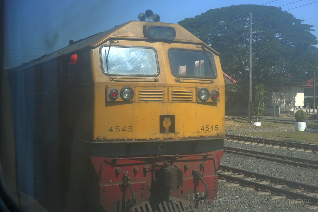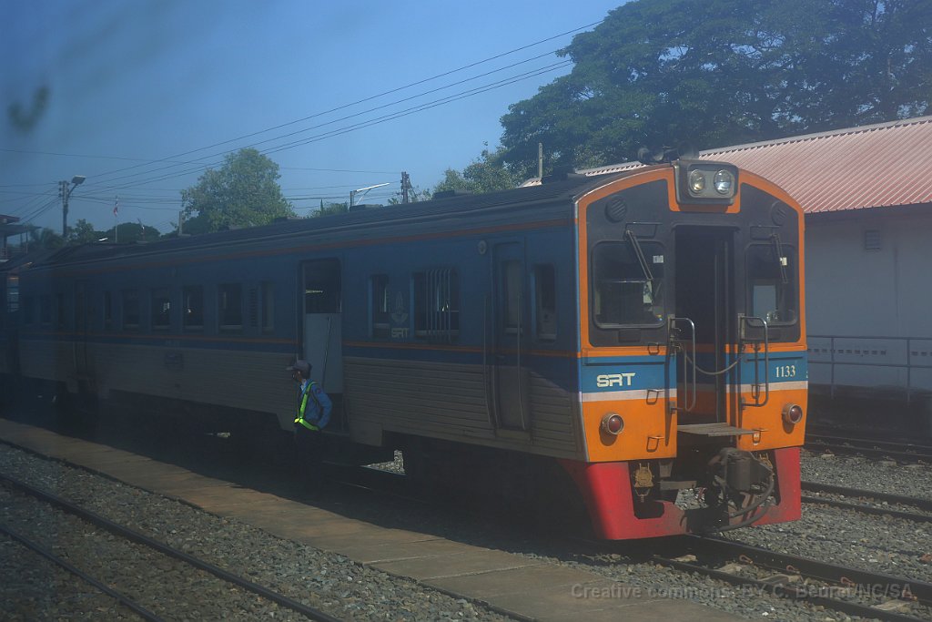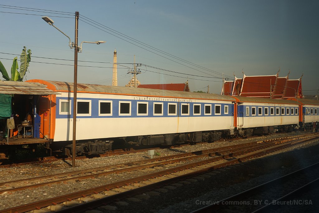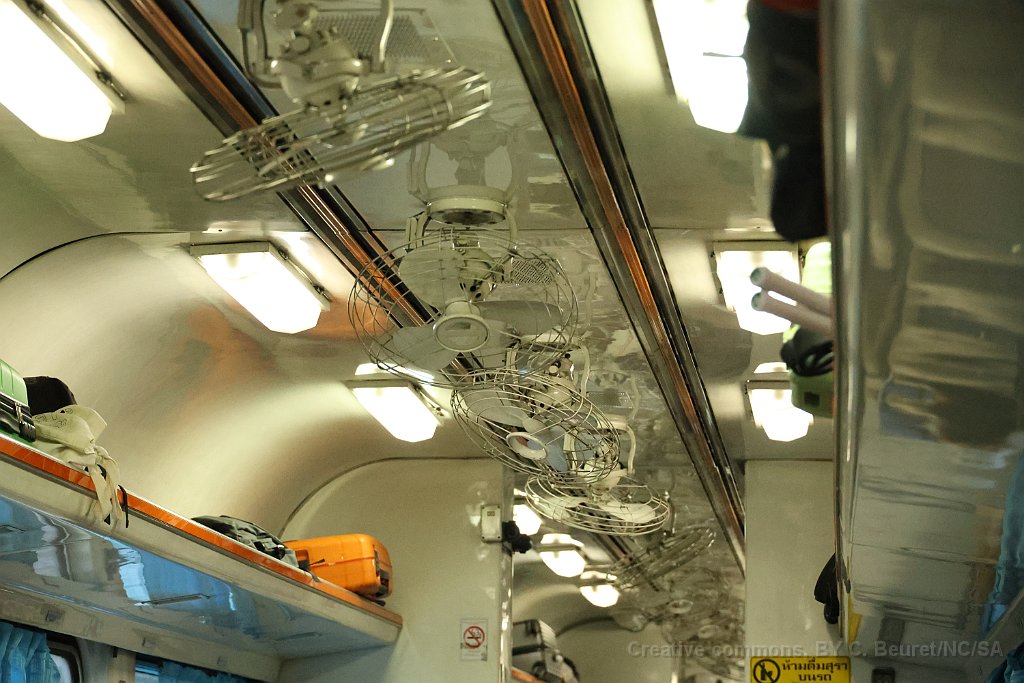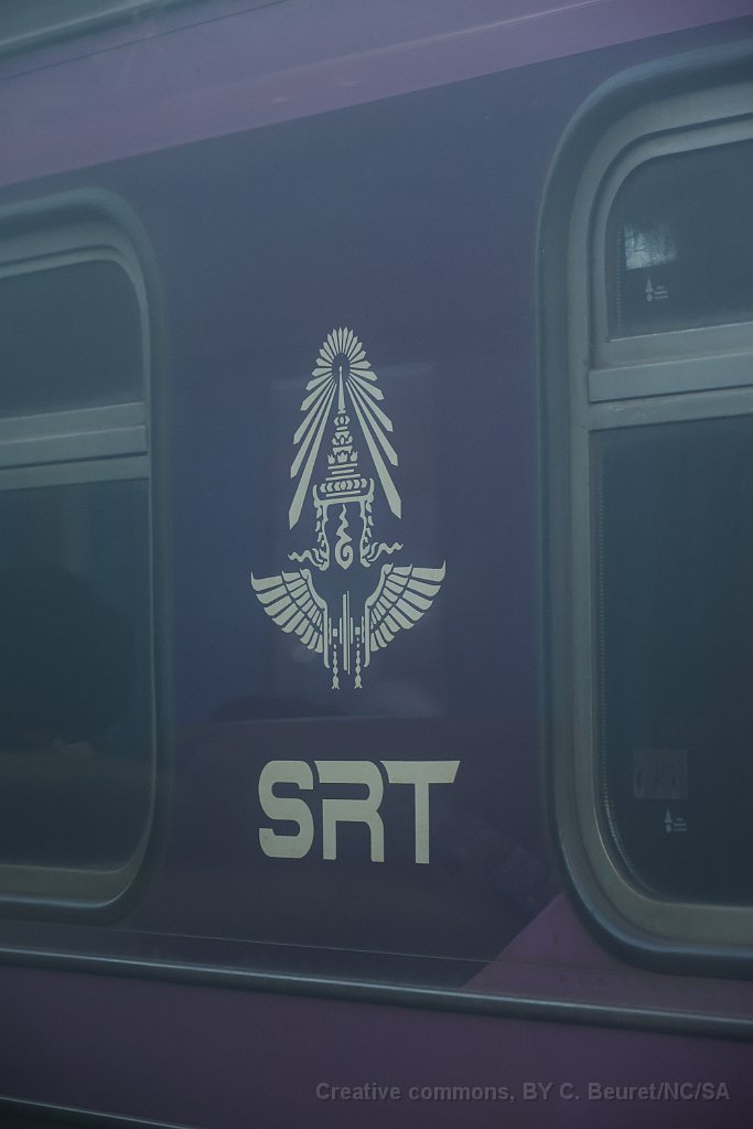 Wagons de marchandise à Ban Phachi Junction Une locomotive de type CM22-7i à Phitsanulok L'automotrice THF était en tête du train Bangkok - Chiang Mai jusqu'à Phitsanulok où elle a été décrochée. Ventilateurs à l'intérieur d'un APD 60 APD 60 à Chiang Mai après 10 heures de voyage depuis Bangkok Logo des chemins de fer Thaï sur une voiture de deuxième classe.