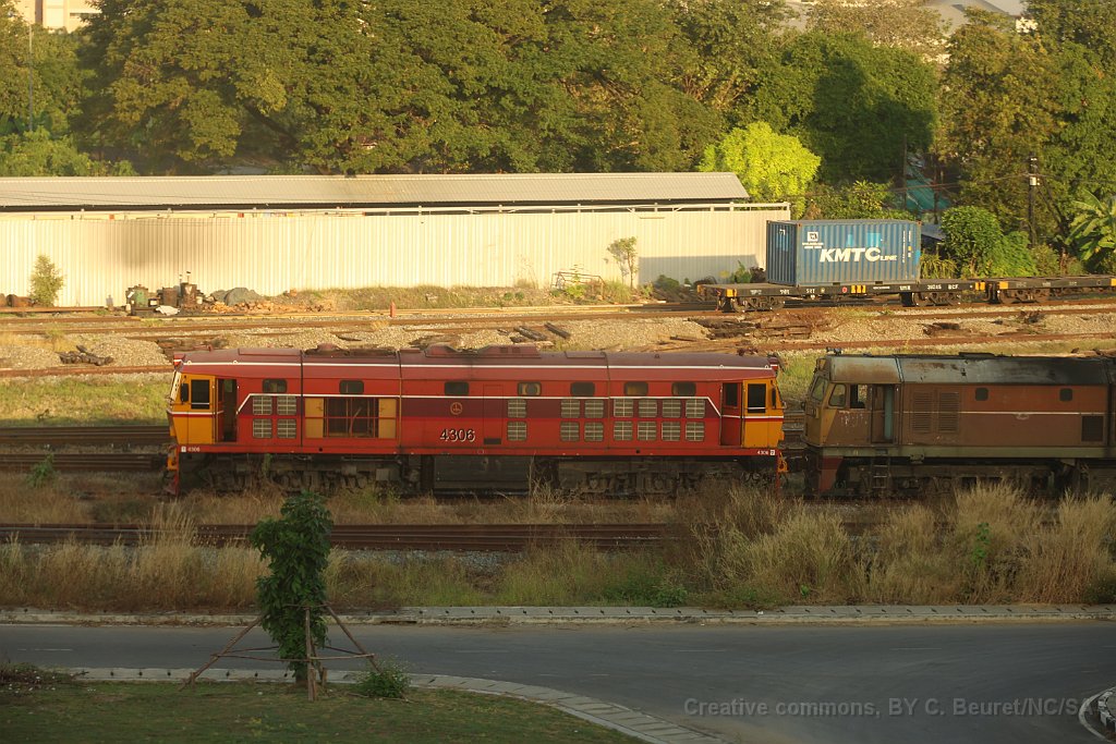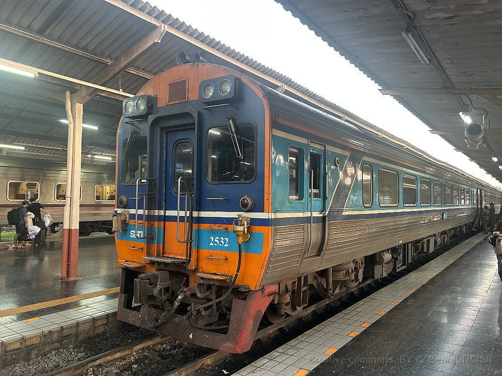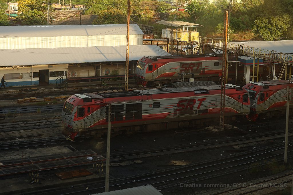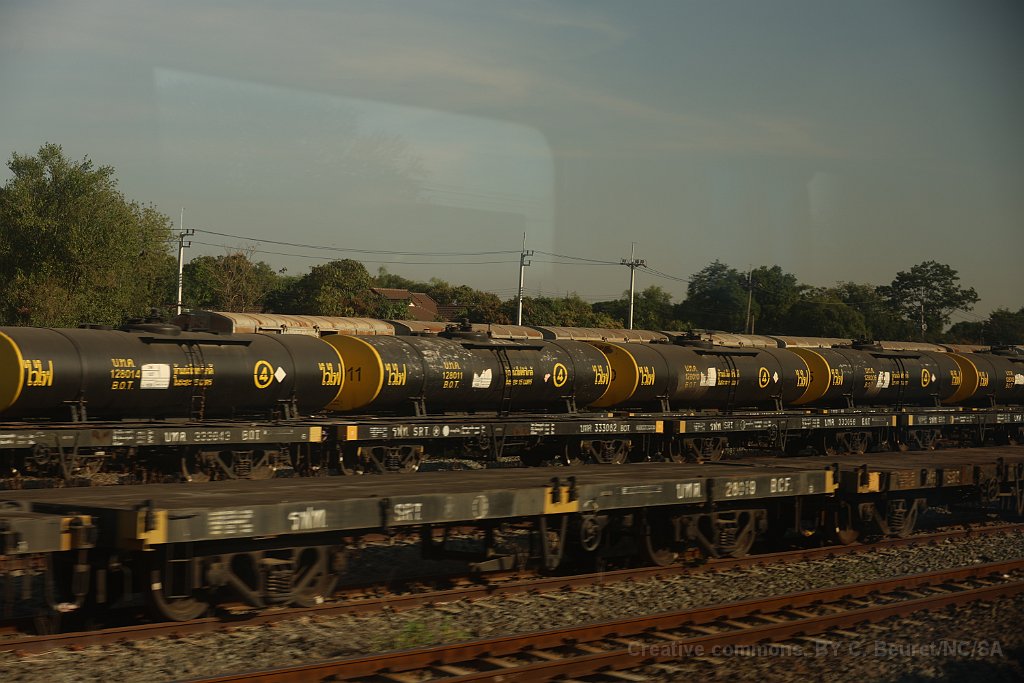 Wagons de marchandise à Ban Phachi Junction Une locomotive de type CM22-7i à Phitsanulok L'automotrice THF était en tête du train Bangkok - Chiang Mai jusqu'à Phitsanulok où elle a été décrochée. Ventilateurs à l'intérieur d'un APD 60 APD 60 à Chiang Mai après 10 heures de voyage depuis Bangkok Logo des chemins de fer Thaï sur une voiture de deuxième classe.